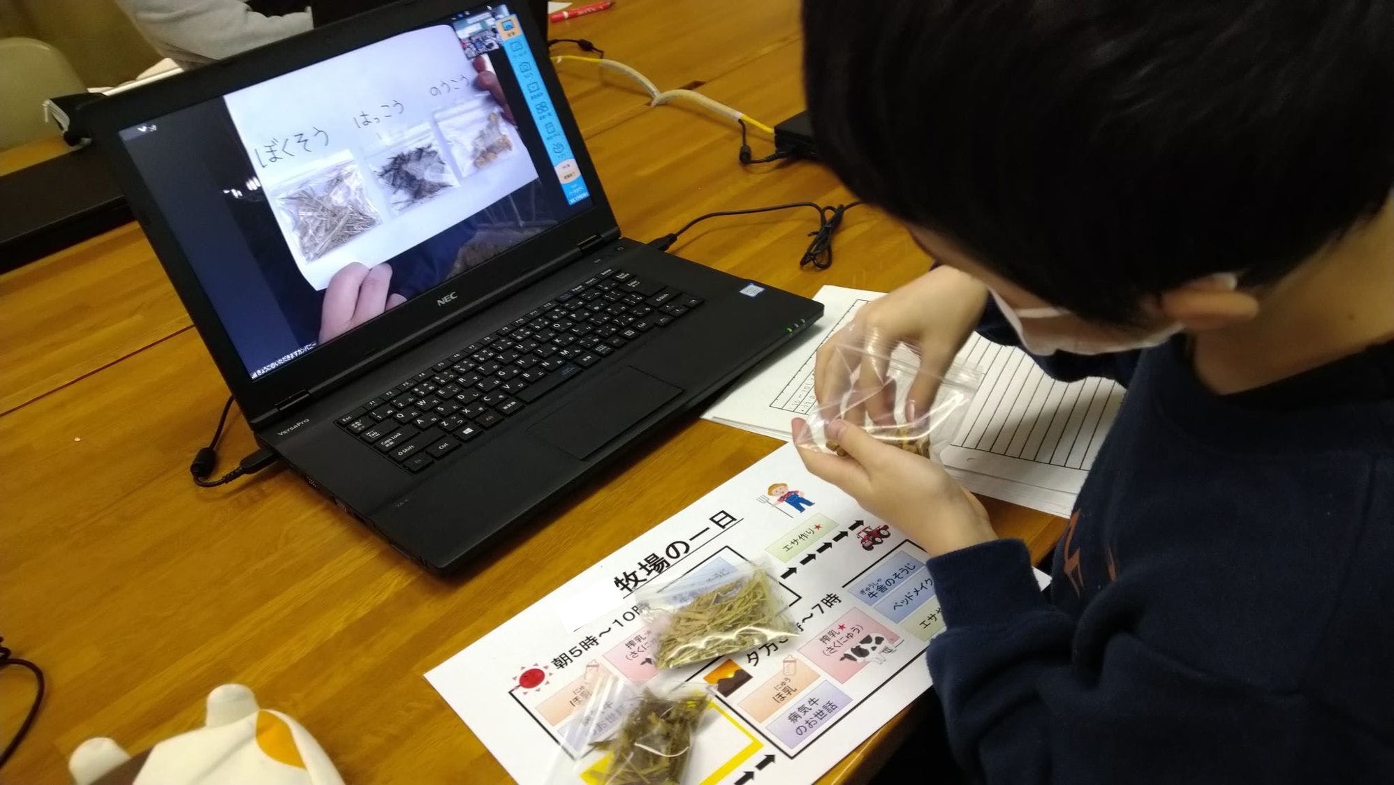 事前に、牛のエサを一人づつ袋に分けて(コロナ対策)学校へ。教室に牧場の香りが届きます。