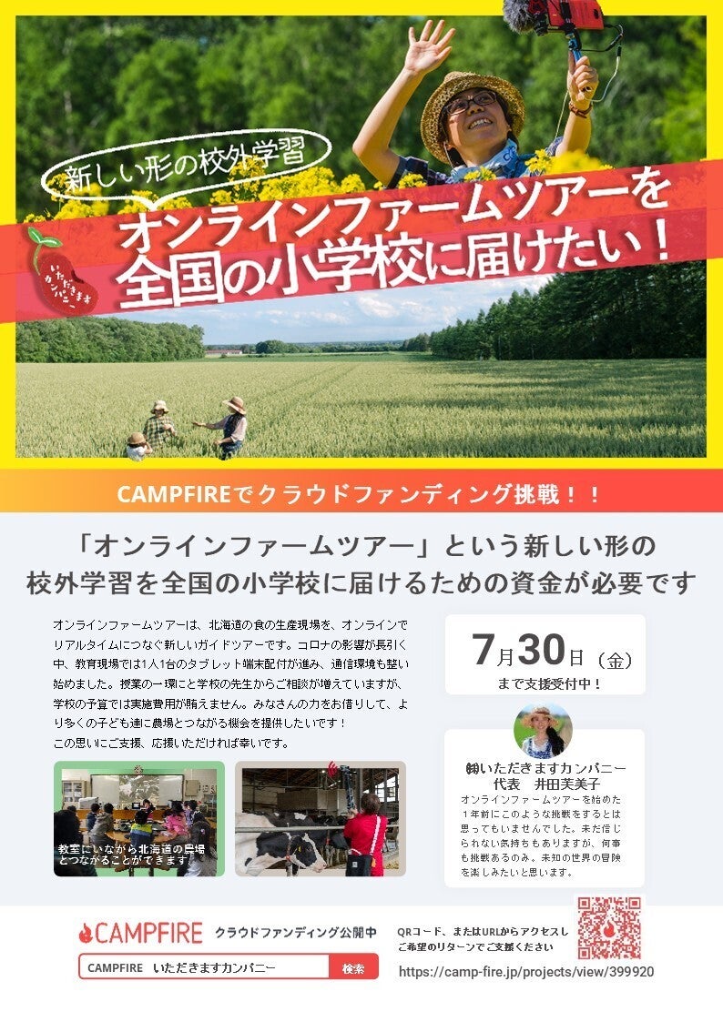 2021/06/21 18:11みなさんこんにちは。井田芙美子です。公開4日目以降は動きが落ち着いてしまい少し焦っていたのですが、本日CAMPFIRE担当の酒井さんからアドバイス頂き、私たちらしく、着実に歩みを進めていこうと気持ちを新たにしたところです。達成までもう一息。ぜひ温かく見守っていただければ幸いです。そこで皆さんにご相談です。このようなクラウドファンディングのチラシを作成しました。あそこに置いたら良いのでは?うちに置いていいよ~はたまた…配ってあげるよ~なんて方がいらっしゃいましたら、ぜひお気軽にご連絡いただければと思います。SNSへのコメント、井田はじめ、知り合いのスタッフへのDM、下記フォームからでも歓迎です。いただきますカンパニーお問合せフォームお声かけ頂ければ印刷したものをお届けいたしますが、チラシの印刷用データもこちらに掲載しておきますので、ご自由にご活用いただければと思います。図々しいお願いで恐縮ですが、引き続き応援よろしくお願いいたします。オンラインファームツアーを全国の小学校に届けたい!印刷用データ達成まではもう一息ですが、既にたくさんのご支援を頂きましたので、予定を早めて、そろそろ学校へのアプローチも進めていこうと思います!では、明日も皆様にとって良い1日でありますように! もっと見る