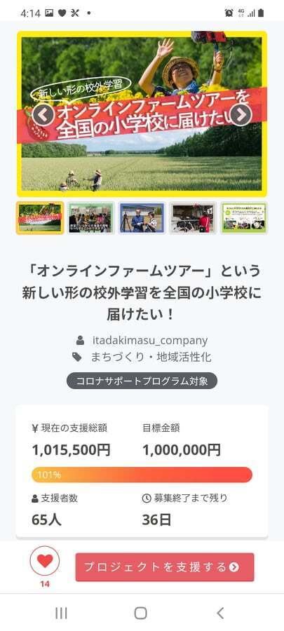 2021/06/24 06:49おはようございます。いただきますカンパニー代表の井田芙美子です。おかげさまで、24日0時過ぎに、目標金額を達成することが出来ました。今晩はもう無理かな…と眠った直後の事でした。ご支援下さった65名の皆様、情報のシェア等応援して下さった皆様、教材開発に関わって下さった農場・学校の先生たち、プロジェクトを応援して下さった全ての人に…心から感謝!!!!!本当にありがとうございました。今までのこと、これからのこと、noteに綴りました。4000字と長くなってしまいましたので、お手すきの時にご覧いただければ幸いです。クラファン10日目で目標達成!!!!!!!|井田芙美子 #note もっと見る【ご相談】チラシの配布について