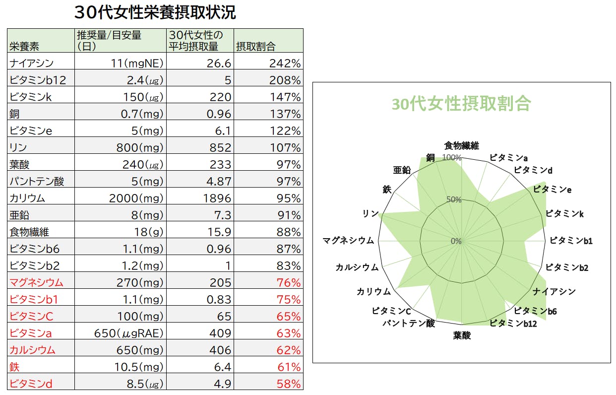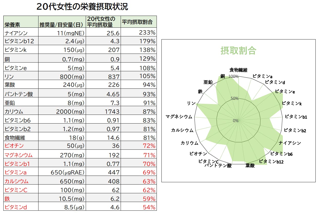その後サプリメントや栄養についてのあらゆる情報を集める中で若年女性の栄養摂取状況の悪さを知りました。私の友人を見渡すと、痩せ願望による小食や偏食、加工食品ばかり食べている人はかなり多く、栄養状況が悪いという結果に納得いく状態でした。