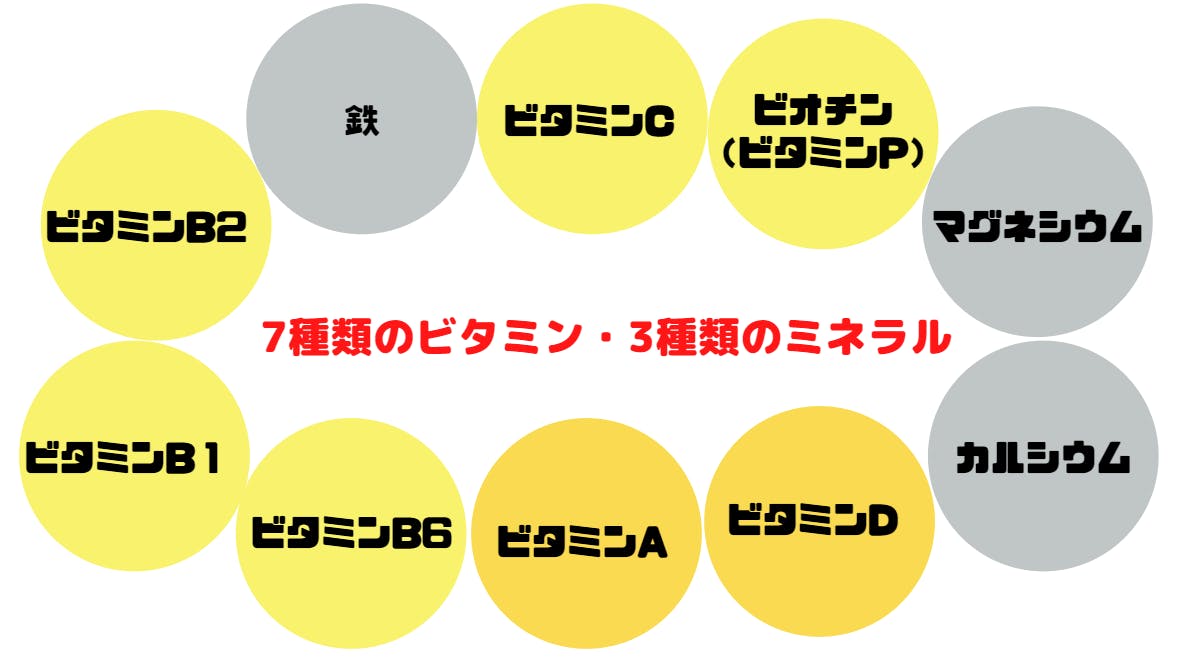 原材料名:酵母(鉄含有)(アメリカ製造)、還元麦芽糖水飴、酵母(ビオチン含有)/貝カルシウム、ビタミンC、セルロース、酸化マグネシウム、ステアリン酸カルシウム、HPC、微粒酸化ケイ素、ビタミンB1、ビタミンB2、ビタミンB6、ビタミンA、ビタミンD