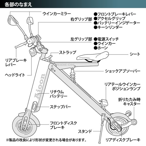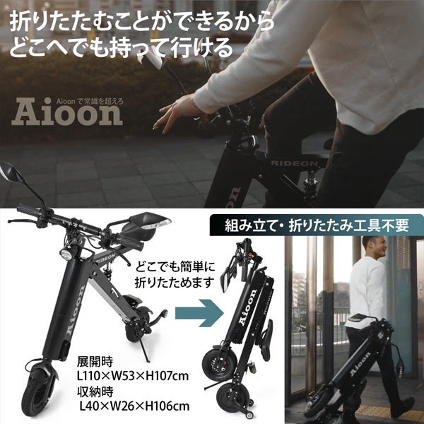 Aioon(アイオーン)はギリシャ語で、時間の日々の生活を劇的に変える、どこに行くのも一緒に行けるバイクがAioonです。Aioonのコンパクトさは、車での移動、電車での移動、移動先でのタクシーの使用など様々なシーンでも活躍します。車に乗せて、移動先で乗ることも電車で移動して、目的地で乗ることもAioonは実現しました。他には無いスマートなデザインかつスタイリッシュさ