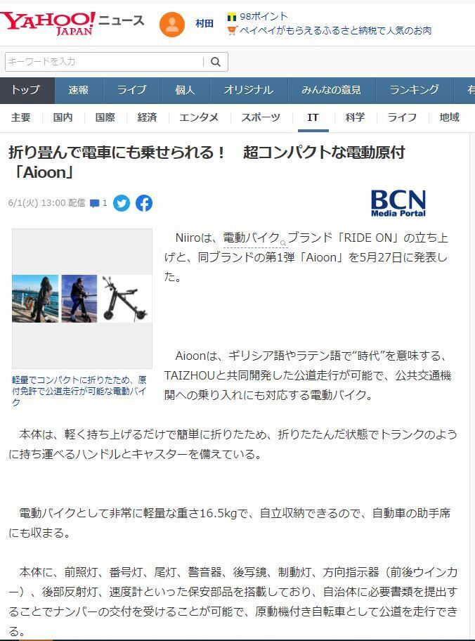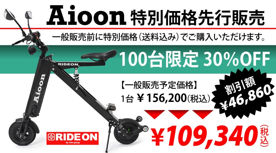 合同会社Niiro(大阪府、代表 村田有起)は、2018年より準備を進めて参りました電動バイクブランド「RIDE ONⓇ」の立ち上げをご報告させて頂くと共に、第一弾となる最小級の公道走行可能で公共交通機関への乗り入れも可能なバイクシリーズ「AioonⓇ」を発表させて頂きます
