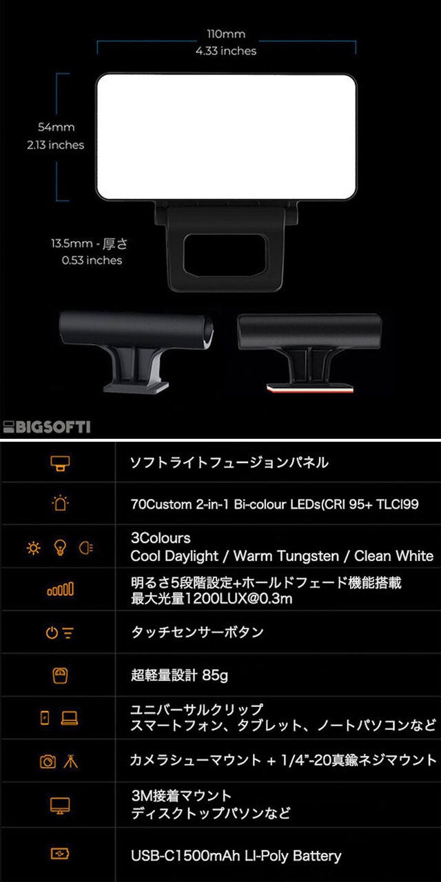 A:幅110mm、高さ54mm、厚さ13.5mm、重量85gです。BIGSOFTIは、スマートフォンと同じサイズのフットプリントを提供しながら、美しい柔らかな光を放つことができるように、可能な限り大きくしました。