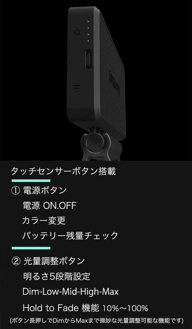 ・光量ボタン長押しによる調光機能10%〜100%ののフェード機能搭載