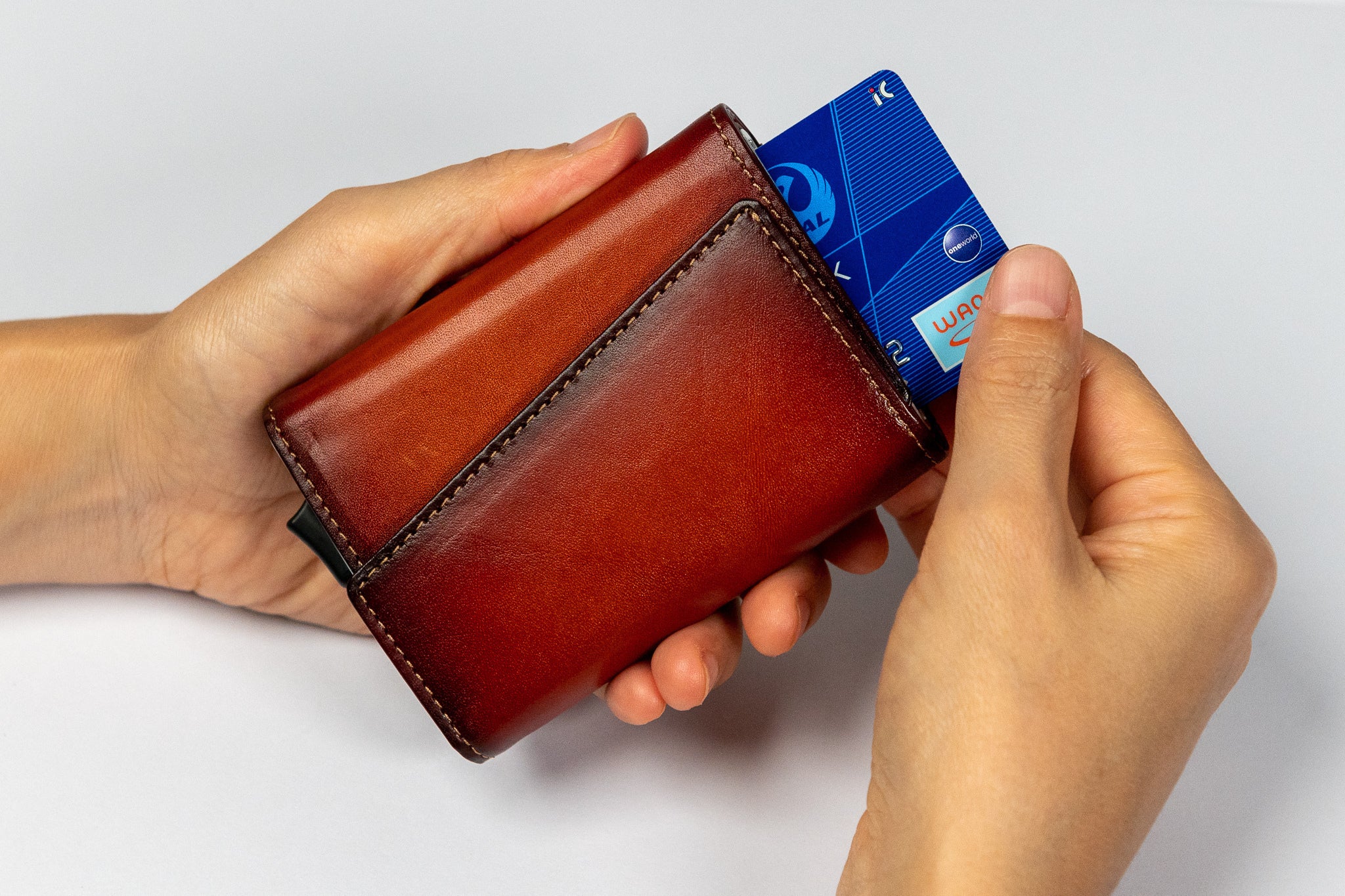 更に、日常生活で使ってみて、小銭入れの使い安さを、そして何よりもワンプッシュでカードが取り出せる事が便利だと強く感じました。