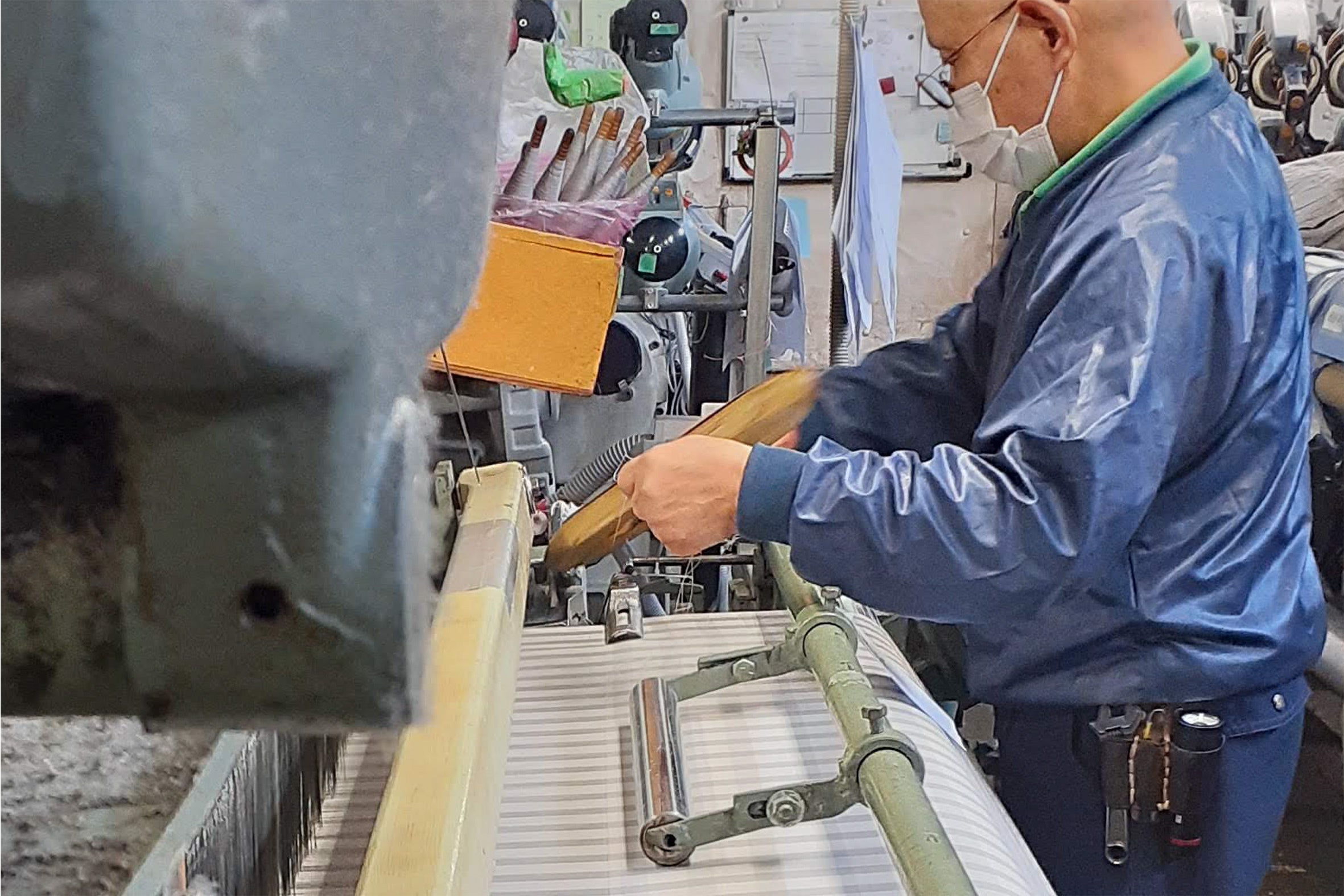 シャトル織機が消えつつある背景に、量産向けに改良された織機に比べ一日に織ることのできる数量が少ないことや、欠点とよばれる使えない箇所ができやすい、巻き取って準備した横糸がなくなる度にそばで補充しなければならないなど、とにかく時間と手がかかり、今の時代にそぐわなくなったことがあります。(エアと呼ばれる空気圧で糸を飛ばす織機と比較すると、生地にもよりますが、その製織能力は1/4程度と言われています。)
