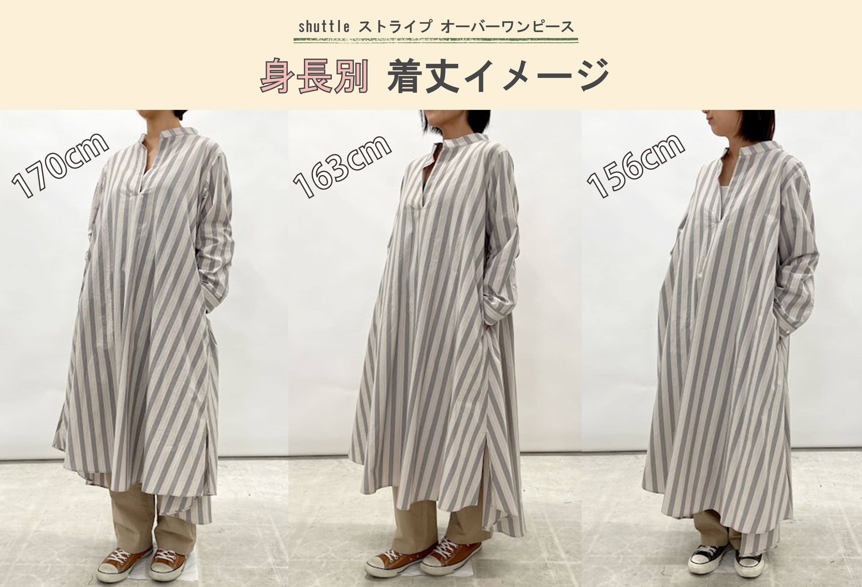 HaTaKaKeのワンピースは着丈、前:109cm/後:118cmでサイズを表記しています。でも実際、自分が着たらどのくらいになるのかってなかなか想像つきませんよね。ということで、①170cm/②163cm/③156cmの3人で試着してみました。比較用にと、一番シンプルなスタイルで撮ってみました。レギンスと合わせて足元をスッキリさせたり、袖をまくってトップをコンパクトに見せ、メリハリをつけたスタイルもおすすめです。また、ワイドパンツと合わせても可愛いシルエットになります。丈感のご参考にいただけますと嬉しいです。※因みに、パンツは①がサイズ2を、②③はサイズ1を履いています。こちらもご参考下さいませ。