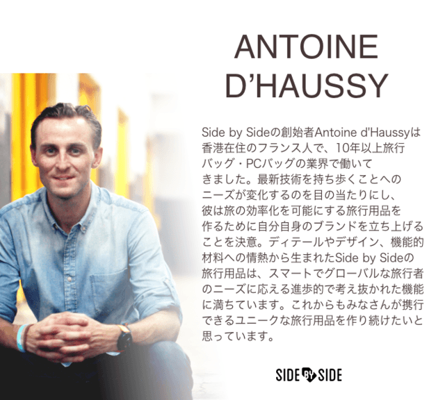 SIDE BY SIDEは香港在住のフランス人、Antoine d'Haussyによって2017年に設立されました。トラベルグッスはもっと進化できる、その思いが形になった初めての製品 Power Packerは現在25ヶ国で販売、熱狂的なファンをつくっています。