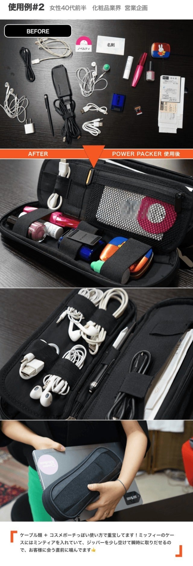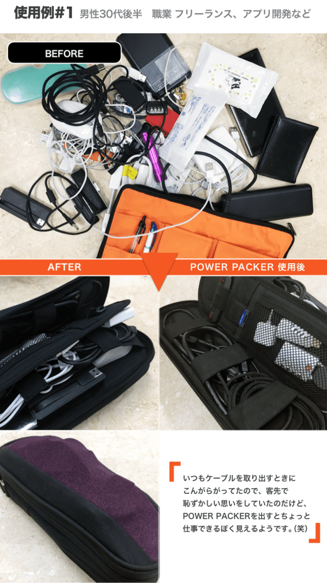 ・在宅とオフィス勤務が半々になってから、PCの電源やケーブルを持ち運ぶのに重宝しています。(40代 女性)