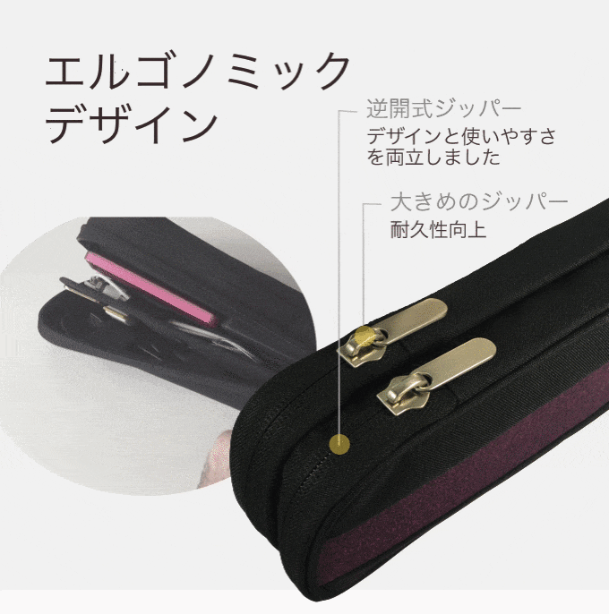 他社製品などではよく#5というサイズが低コストのため使われることが多いのですが、使いやすさと3年保証の耐久性を実現するために、コストをかけて#8というジッパーサイズを使っています。ジッパーが大きいと指でつかむまでの一瞬の手間(時間)が省けるので、ストレスフリーで使っていただけます!