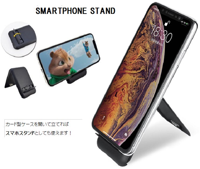 1. カードケースを開いて立てます。2. 棚を開きます。3. 開いた棚にスマホを乗せてください。