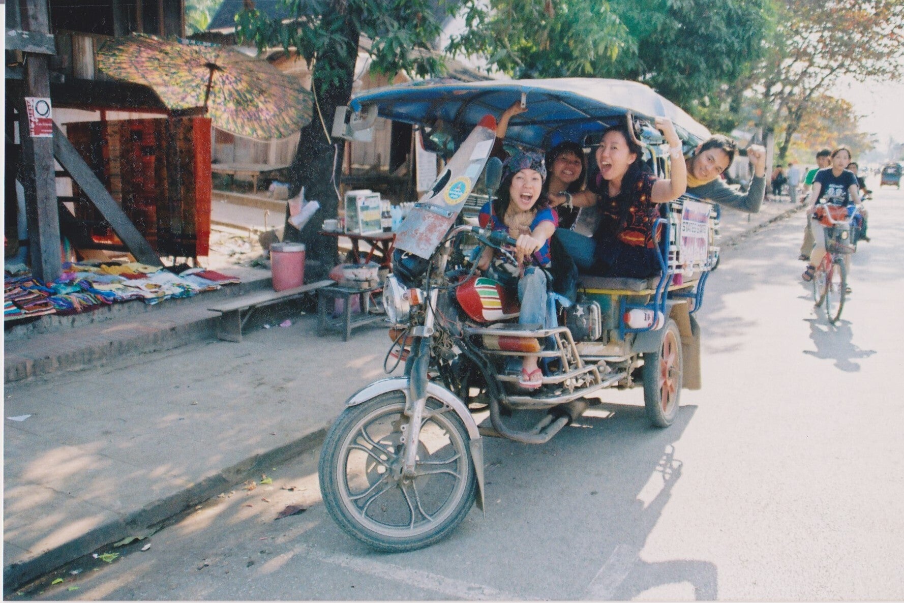 冒頭の画像はタイ人学生ヘルパーのビックさん、シルバーさん、筆者の長谷川、学生が乗ったトゥクトゥクの写真でした。ここまでお見せした写真のとおり結構サバイバルなメコン川での野宿や宴や船の旅を終えてようやく到着したラオス・ルアンプラバーンの街で、ついはしゃぎたくなる気持ちを、きっとご想像いただけるのではないかと思います。
