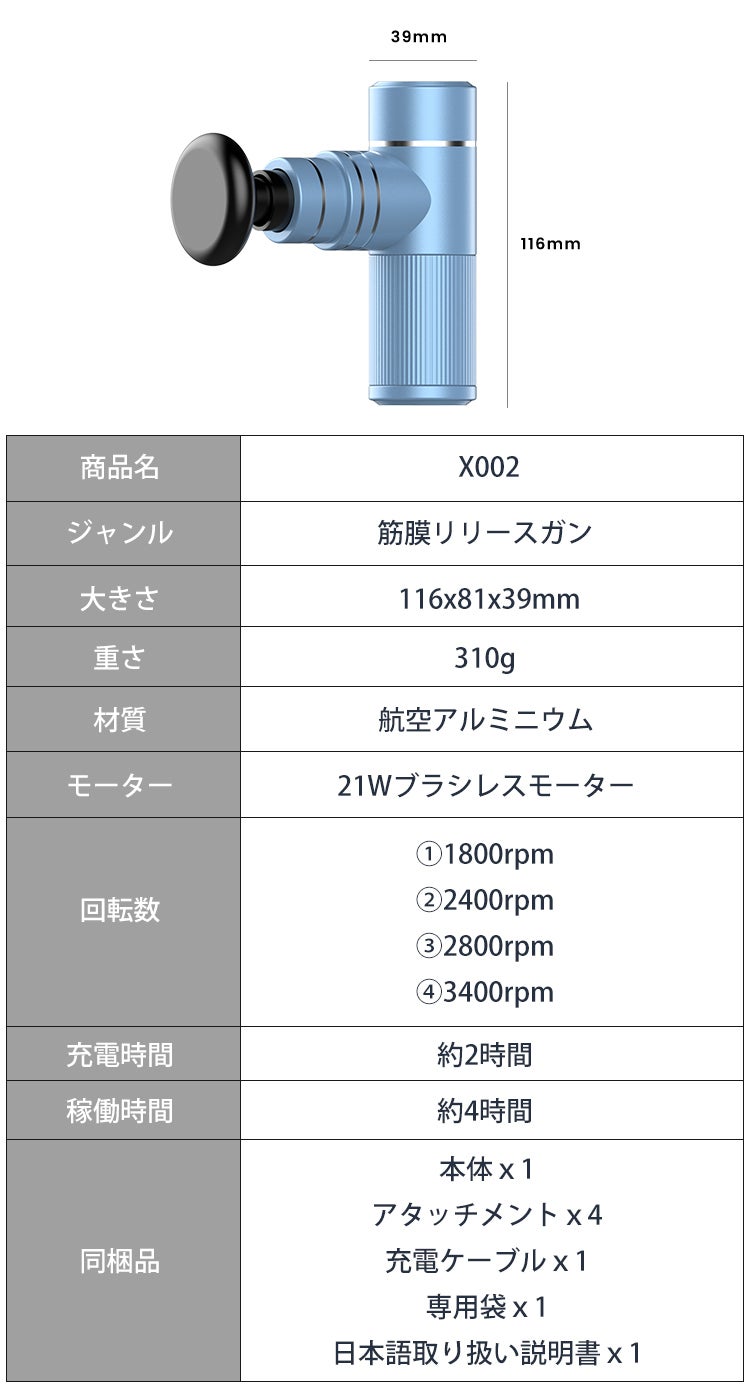 遂に登場した業界最軽量グラスの超小型筋膜リリースガン「X002」!たったの310g、コンパクトなのに強力パワーを実現。21Wのブラシレスモーターが内蔵され、最大毎分3,400回転。付属の4種類アタッチメントで体の部位に合わせて効果が発揮できます。