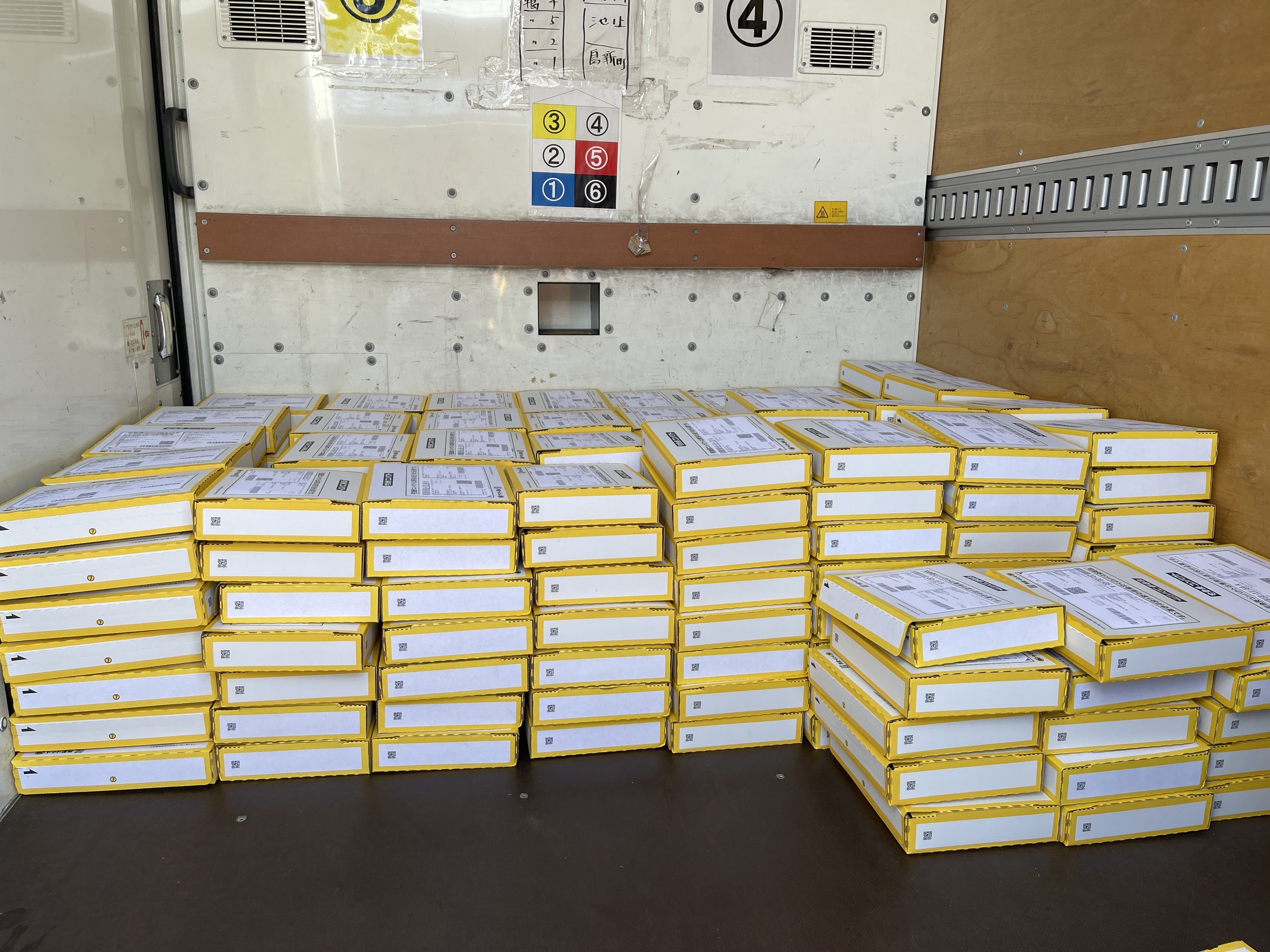 どんどん商品が詰まれていき、今回は完成品が大きい作業台にも収まりきらず、まるまる3日間ずっと梱包し続けました。それだけ、たくさんの方から温かい思いが寄せられた証拠だと思います。本当にありがたく思っています。