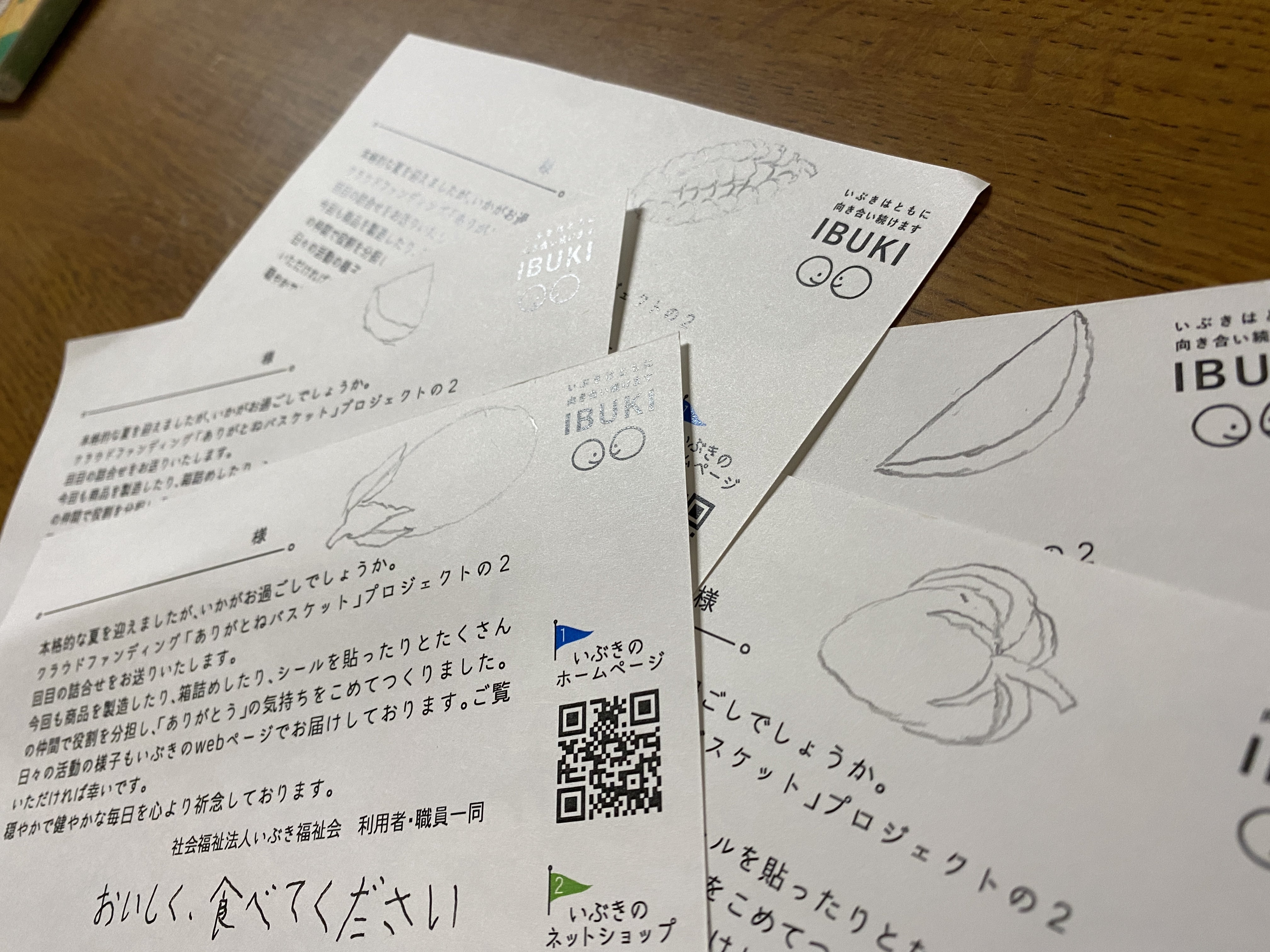8月10日にありがとねバスケットをいぶきより一斉発送させていただきました。(一部の方は発送日が前後しています。)