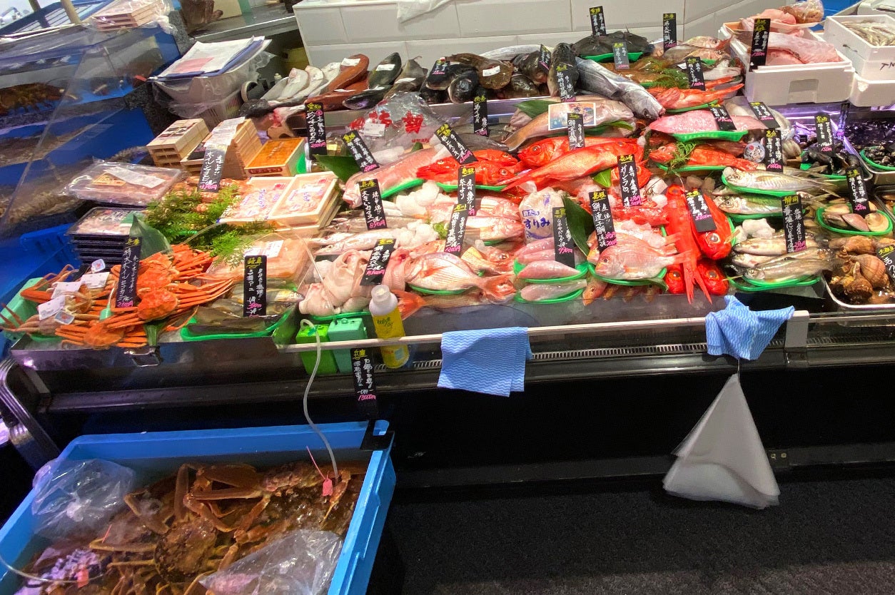 実は、僕の担当していた頃の鮮魚コーナーは少し変わっていました。大阪の百貨店よりも品揃えが多く、高級魚のクエや伊勢海老・白甘鯛・もうかの星(ネズミザメの心臓)など珍しい魚が並び、見た目は市場さながらでした。