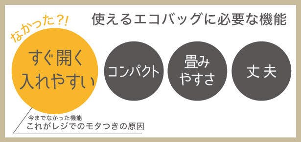 私たちは、コンビニ店員さんの「レジ袋スタンバイ」にヒントを得て、バッグを「自立」させれば、両手が使えて作業が早くなる=「入れやすい」と考えました。