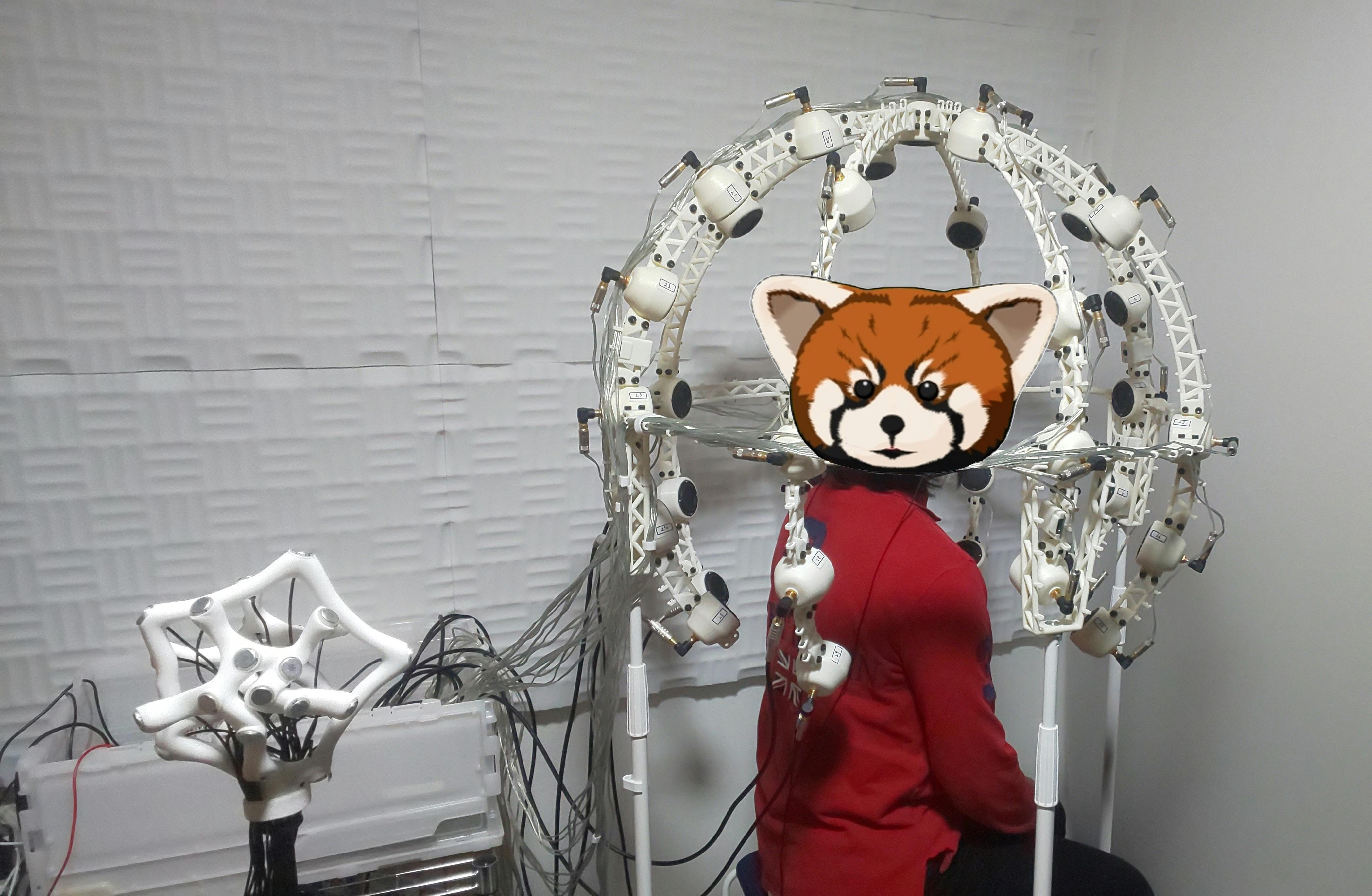 しかし、音の変化は個人差による影響が大きく、それに伴ってHRTFも個々人で大きく異なった特性になってしまいます。そのため、従来のコンテンツは、個人個人の特徴が平均化されたHRTFを用いて制作されているため、個人によって空間の感じ方や音色の再現に差が生まれ、本来の空間感や質感の再現に限界がありました。また、個々人特有のHRTFを計測するためには音の反射が発生しない無響室という特別な部屋に多数のスピーカーを360度全方位に配置するといった大掛かりな設備が必要な上、HRTFを計測されるユーザーは計測終了まで長時間動いてはいけないという苦行に耐えなくてはなりませんでした。今回のプロジェクトに使用される技術は、まさにこのHRTFの計測を従来よりも遥かにコンパクトに、短時間で、非常に高精度に行うものになります。