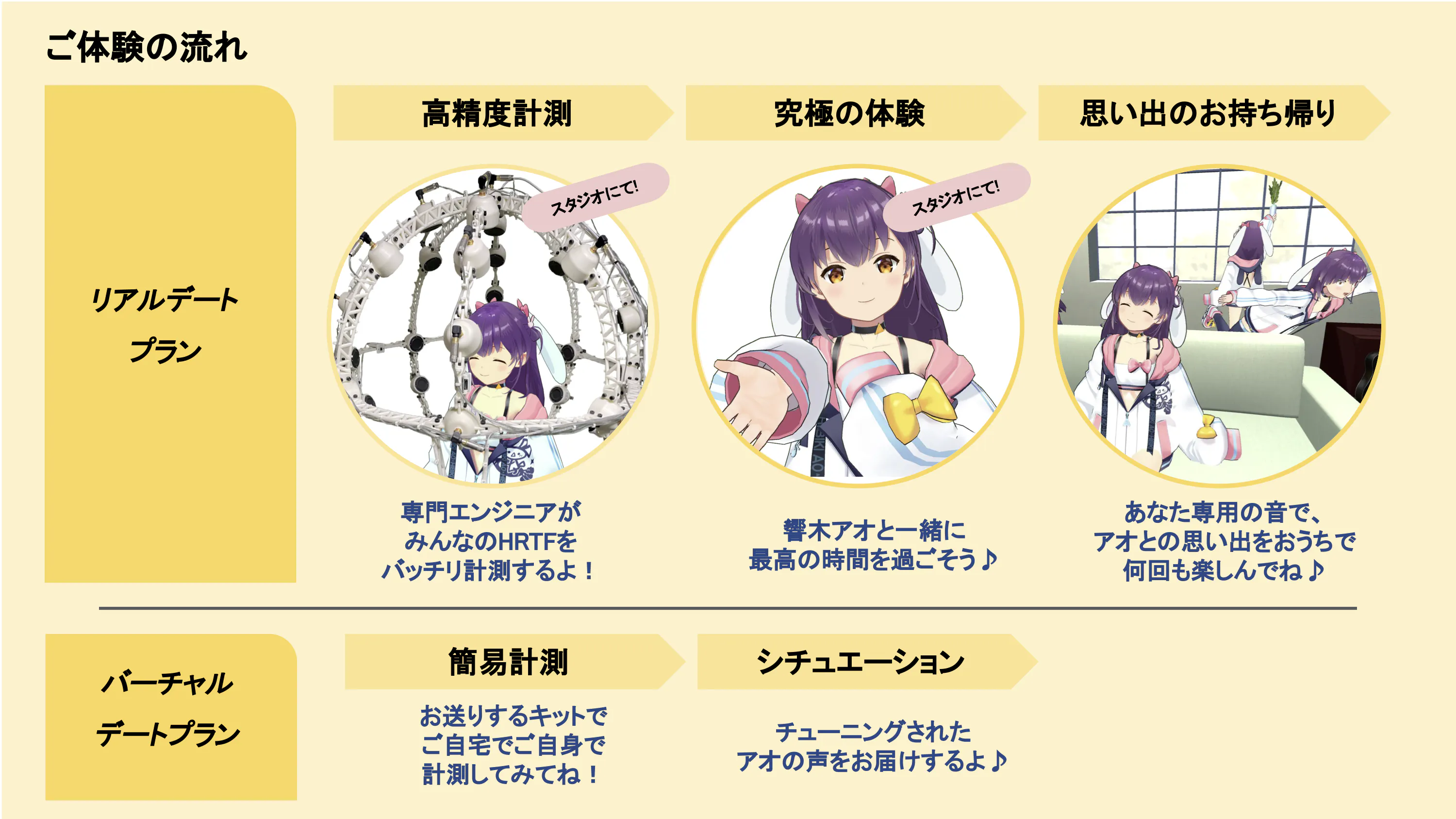 こちらは専用に開発されたHRTF計測キットをプラン購入者のもとに送付し、ご自身で計測していただいたHRTFを元に自分だけのために最適化されたコンテンツを体験していただくプランになります。音源データは今回の為に特別に制作された響木アオのとある一日を体験するオリジナルコンテンツとなっています。