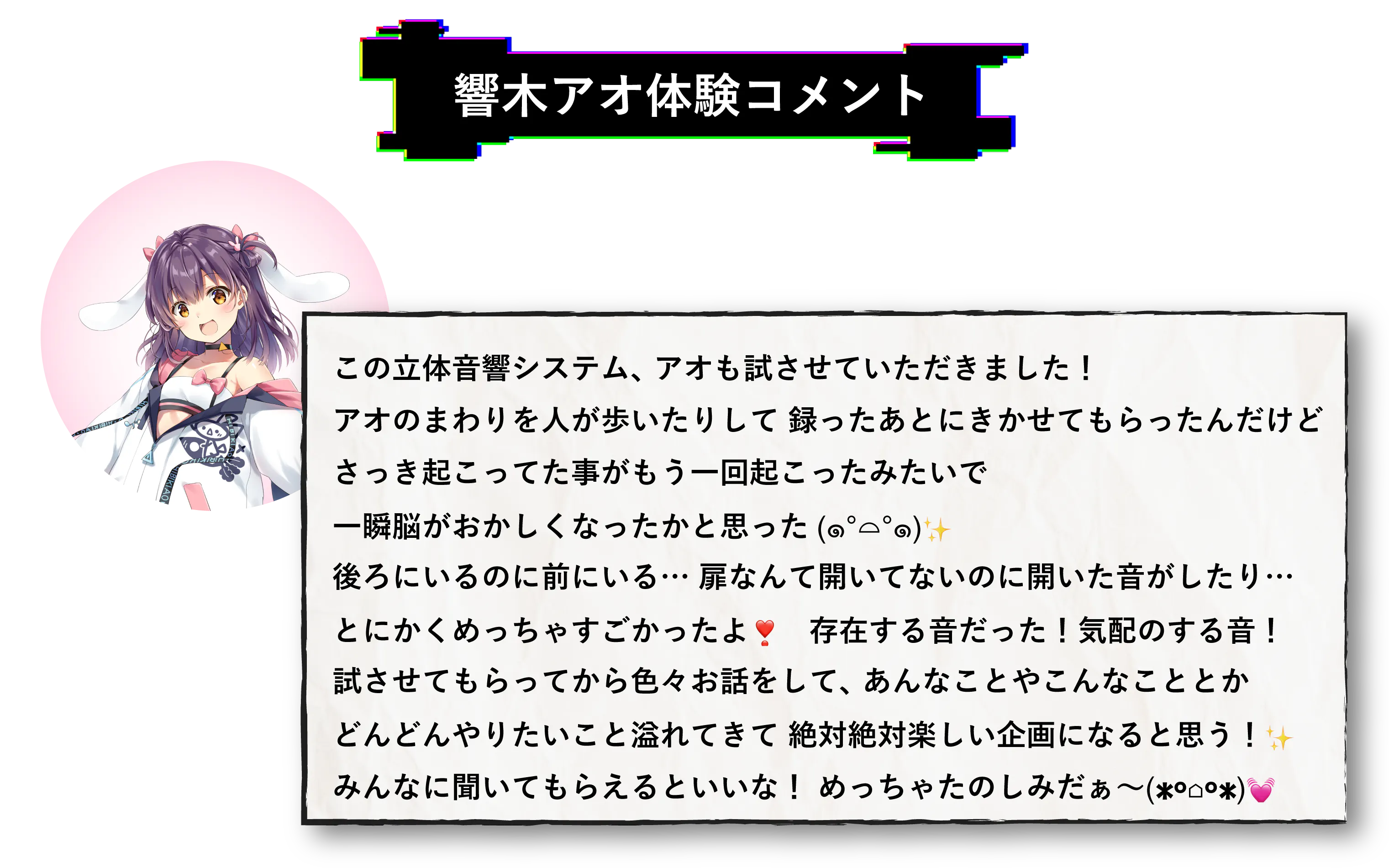 A:従来のバイノーラルやASMRは、平均的な耳の形をしたマイクで録音されたものでした。今回は、支援者の方、個人個人の耳に合わせますので、より一層、響木アオちゃんの存在感を感じることができます!