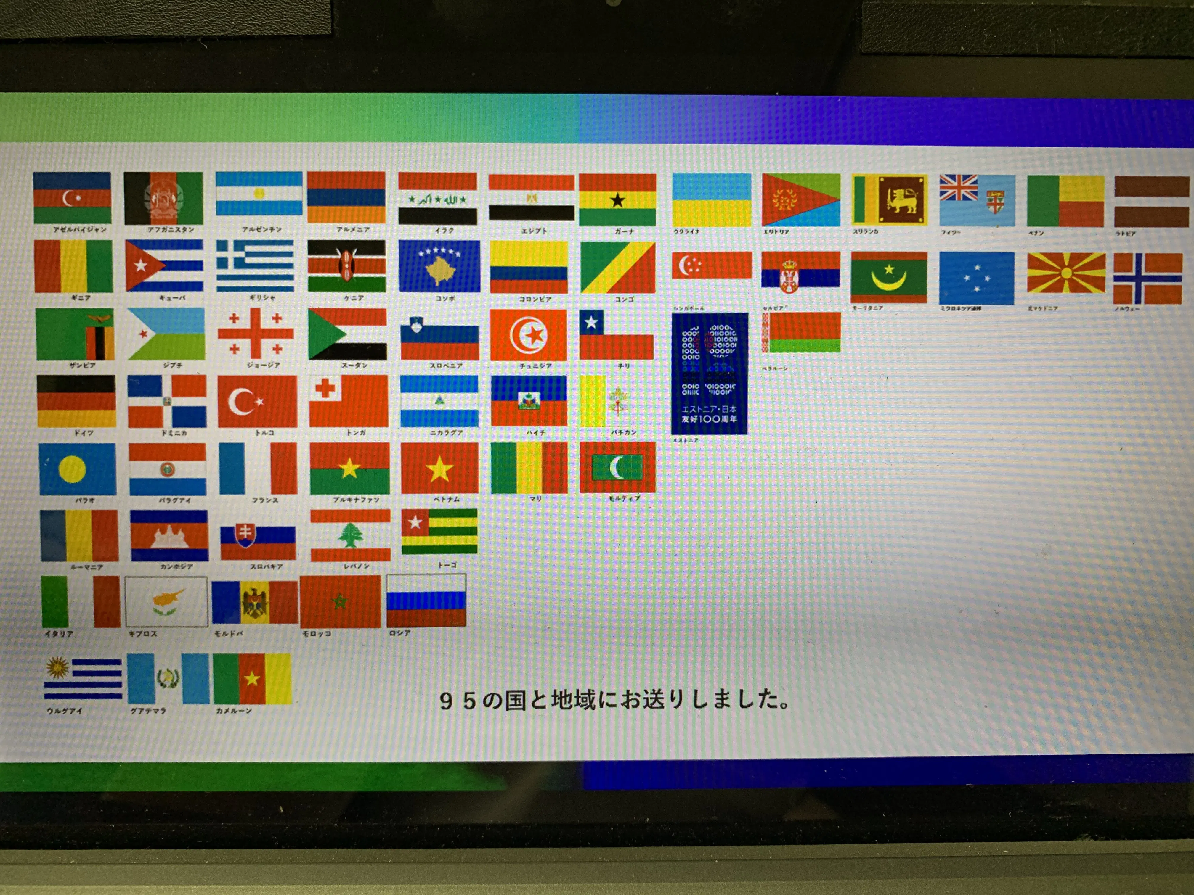 今までご説明させていただいた贈り物を受け取っていただいた国と地域はなんと95もございました。国旗の掲示を許可いただいたところを画像添付させていただいておりますが、このさまざまな国旗をみているだけでも、この一つ一つの国ってどんな人が住んでいて、どんな文化風習があって、どんな素晴らしい景色があるのか、考えただけでもワクワクしてこないですか?