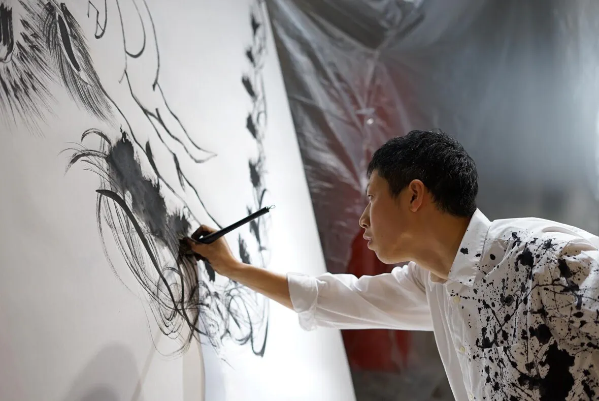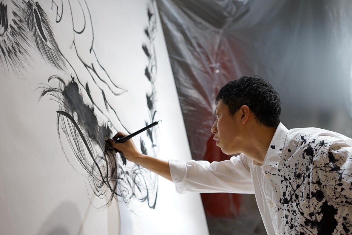 この龍と恩返しプロジェクトのロゴを、京都の書道パフォーマー 稲垣尚毅さんに描いていただきました。稲垣さんからは、