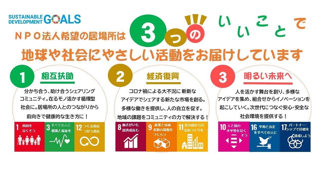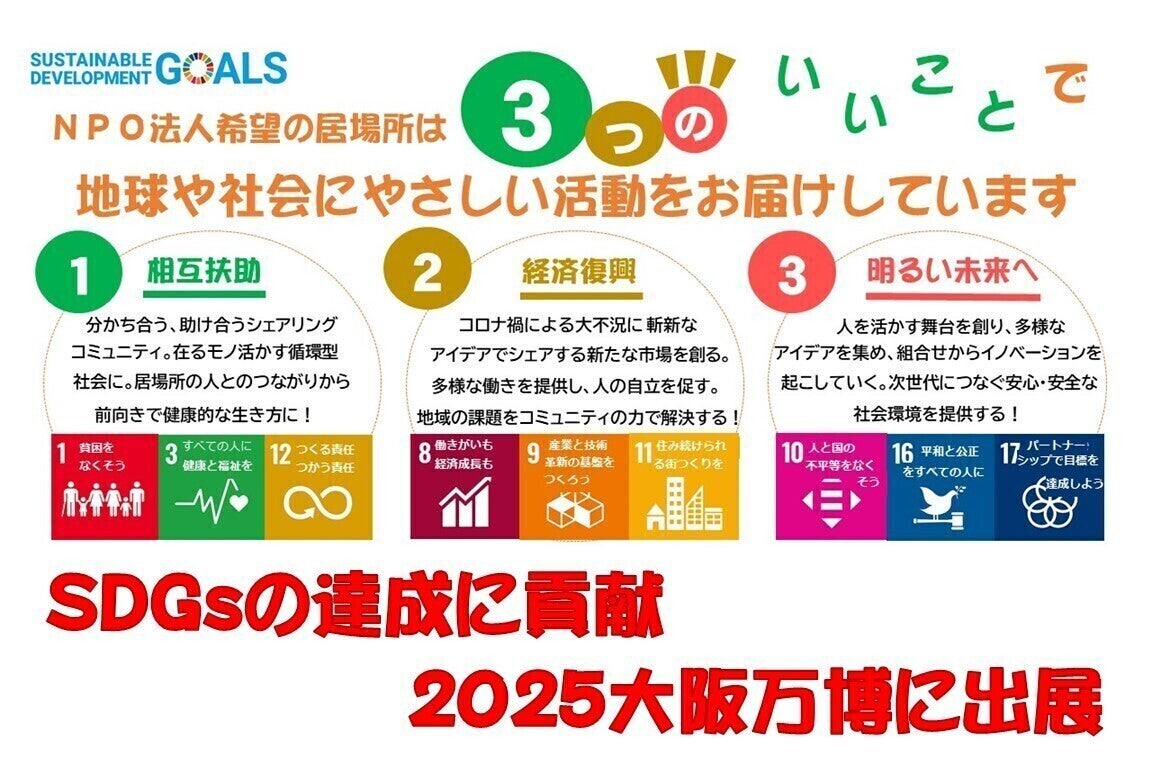 大阪万博の事業のひとつが、「SDGs達成に貢献する」です。NPO法人希望の居場所は、3つのいいことで地球や社会にやさしい活動を届けます。1つ目は、協力し助け合う「相互扶助」のコミュニティ活動です。2つ目は、シェアリングエコノミー事業を主とし、斬新なアイデアで新たな市場を創る「経済復興」です。そして、1000人文化祭により、様々なアイデアを集積し、その組合せからイノベーションを起こします。そこから3つ目の「明るい未来へ」つないでいきます。