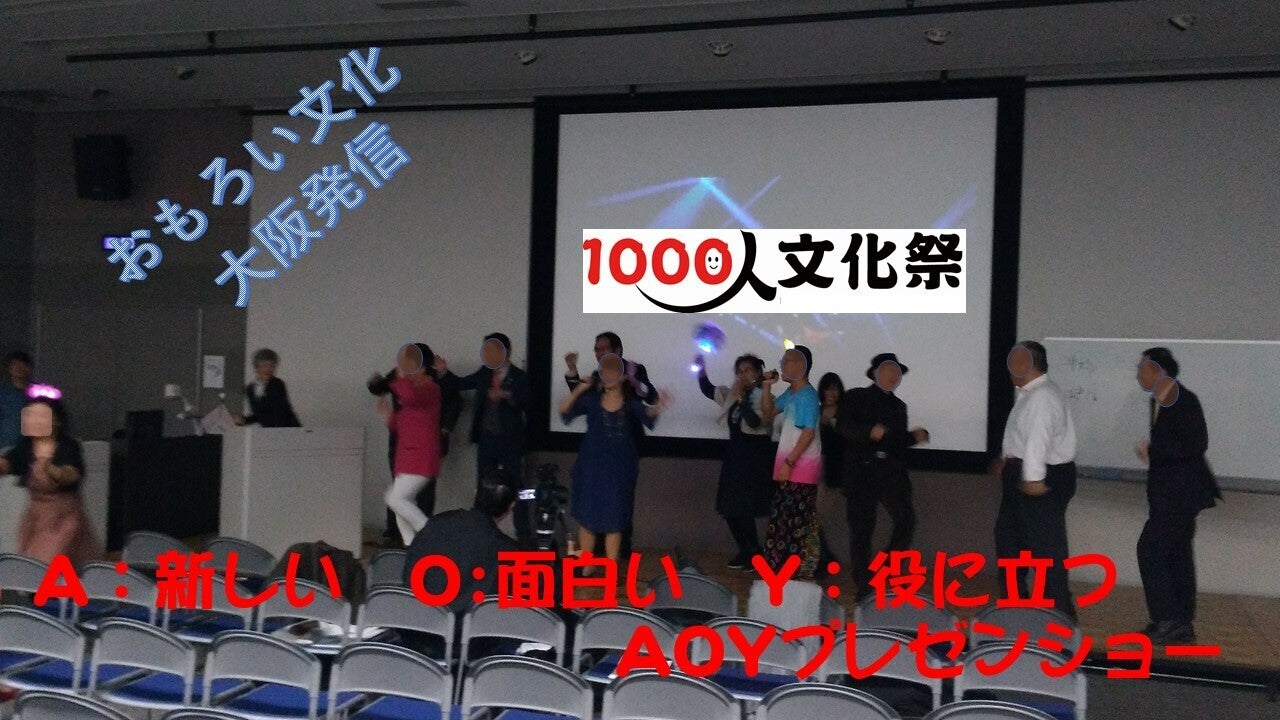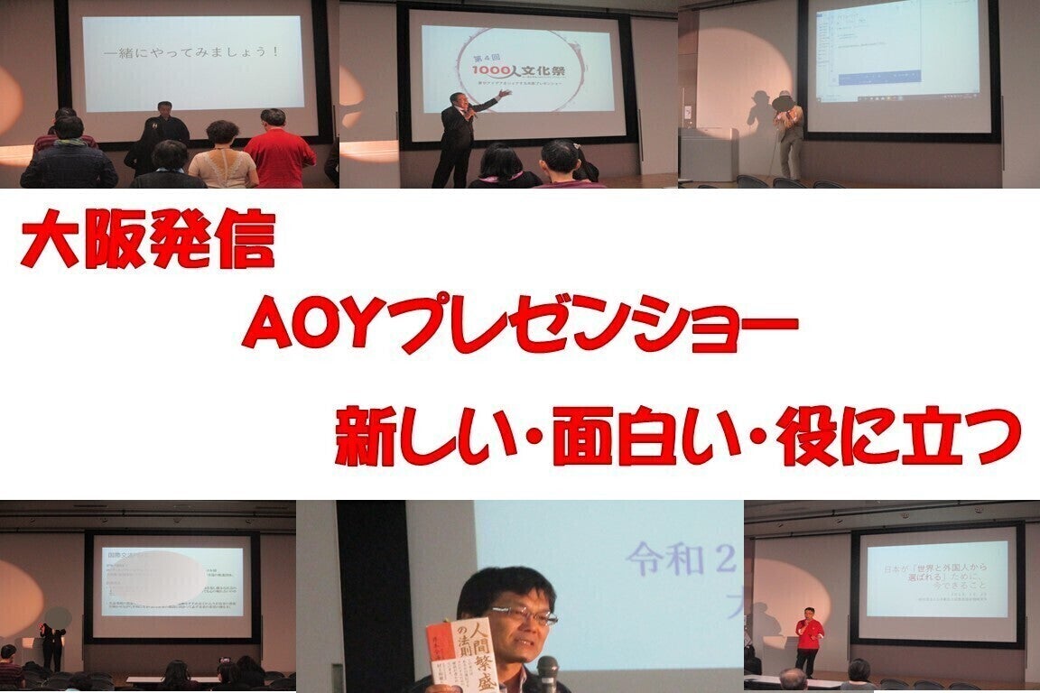 大阪は、「おもろい文化」のまちです。ボケと突っ込みが、大阪を明るくしています。1000人文化祭は、大阪発信のプレゼンショーです。つまり、大阪の「面白い」が原点です。そこに、社会貢献の「役に立つ」と革新の「新しい」を入れたのが、AOYプレゼンショーです。