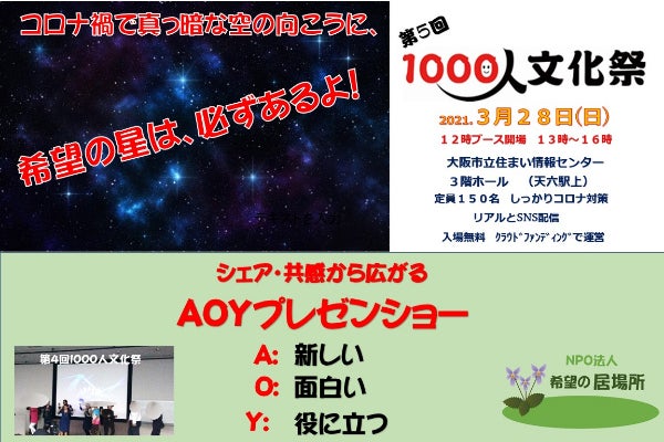 第5回1000人文化祭は、2021年3月28日(日)12時にブース開場、13時からAOYプレゼンショーが始まり、16時閉幕です。リアル以外に、SNSで配信します。後日に編集した画像をYoutubeに流します。