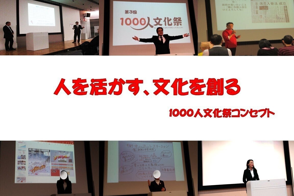 1000人文化祭は、「人を活かす、文化を創る」をコンセプトにしています。夢やアイデア、強みを舞台の上で熱く語り、人を活かします。そして、未来につなぐ文化を創っていきます。「文化」とは、カルチャーで、耕すから来ています。様々なアイデアを集め、人がつながり、その組合せから化学変化を起こします。そして、イノベーションが起れば、未来につなぐ文化となります。