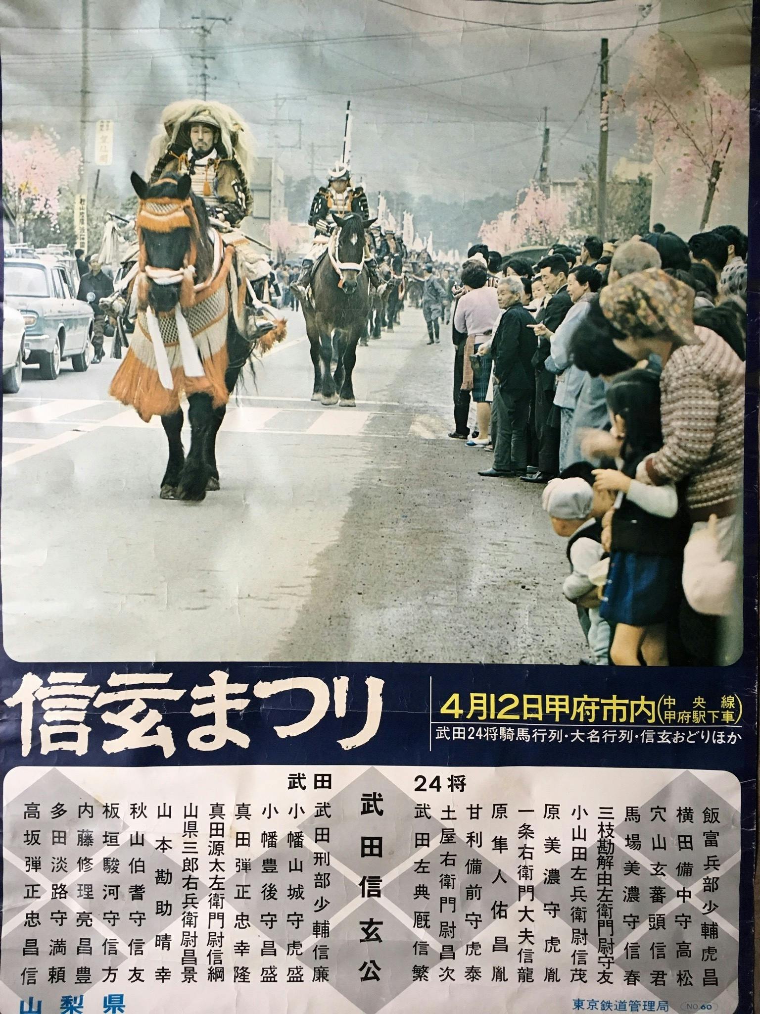 昇仙峡のことを知ることはとても大切だと思いながらも、まずは自分達の歴史的背景の確認も重要だと思い実家で写真アルバムやらご近所さんも含め聞き取り調査をしてみました。すると、かなり大きいポスターが実家の玄関にあり真ん中にいる信玄公役の人が私の祖父であることを確認!アルバムからは昇仙峡で祖父が乗馬で人々を運ぶシーン⁈を発見、実際のところただの家族写真でした!汗 ただし背景や車の位置などを考えると昇仙峡の街道であることは間違いないです!