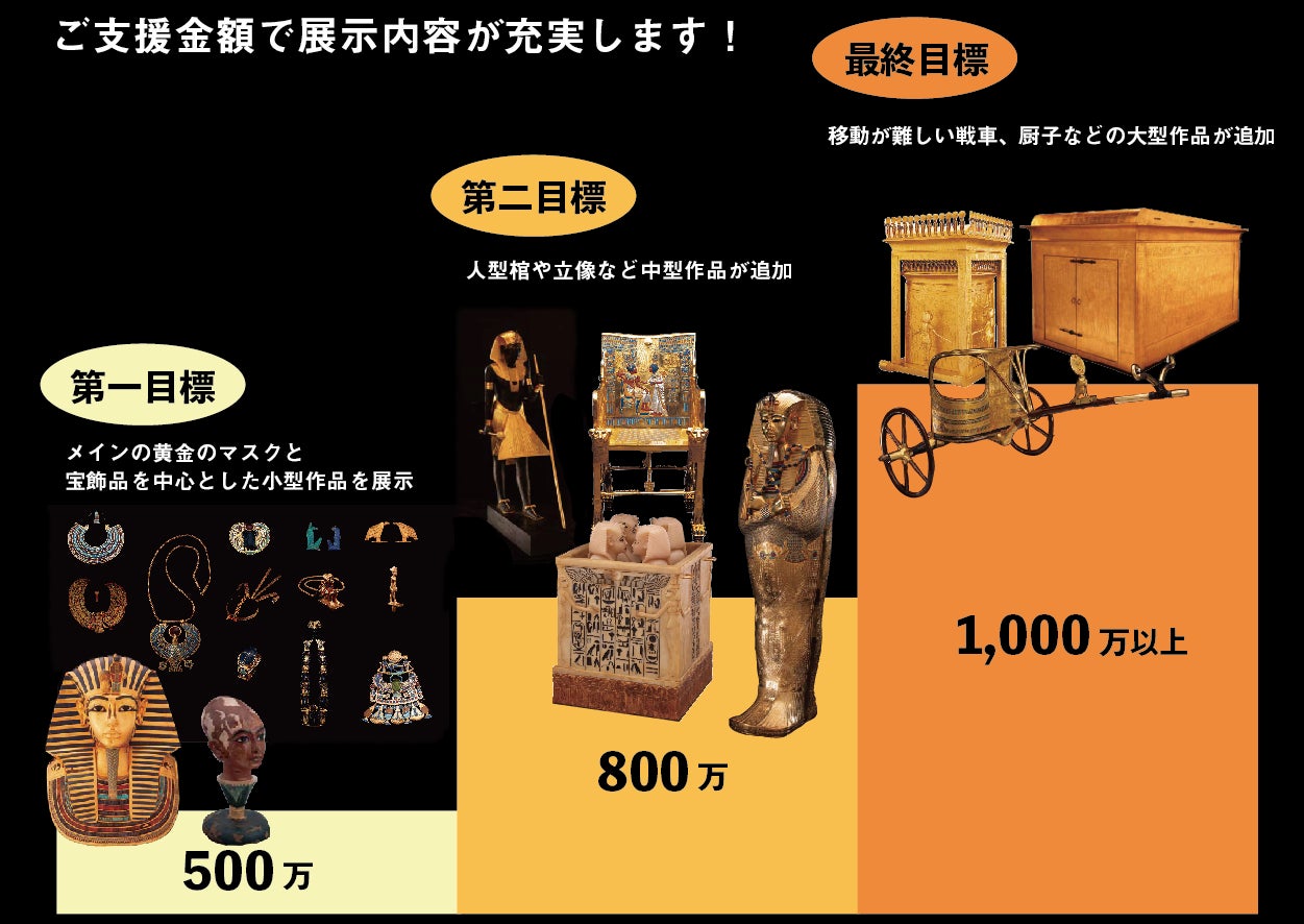 そこでご支援金額の目標を3段階にわけ、金額によって展示内容を充実させていきます。