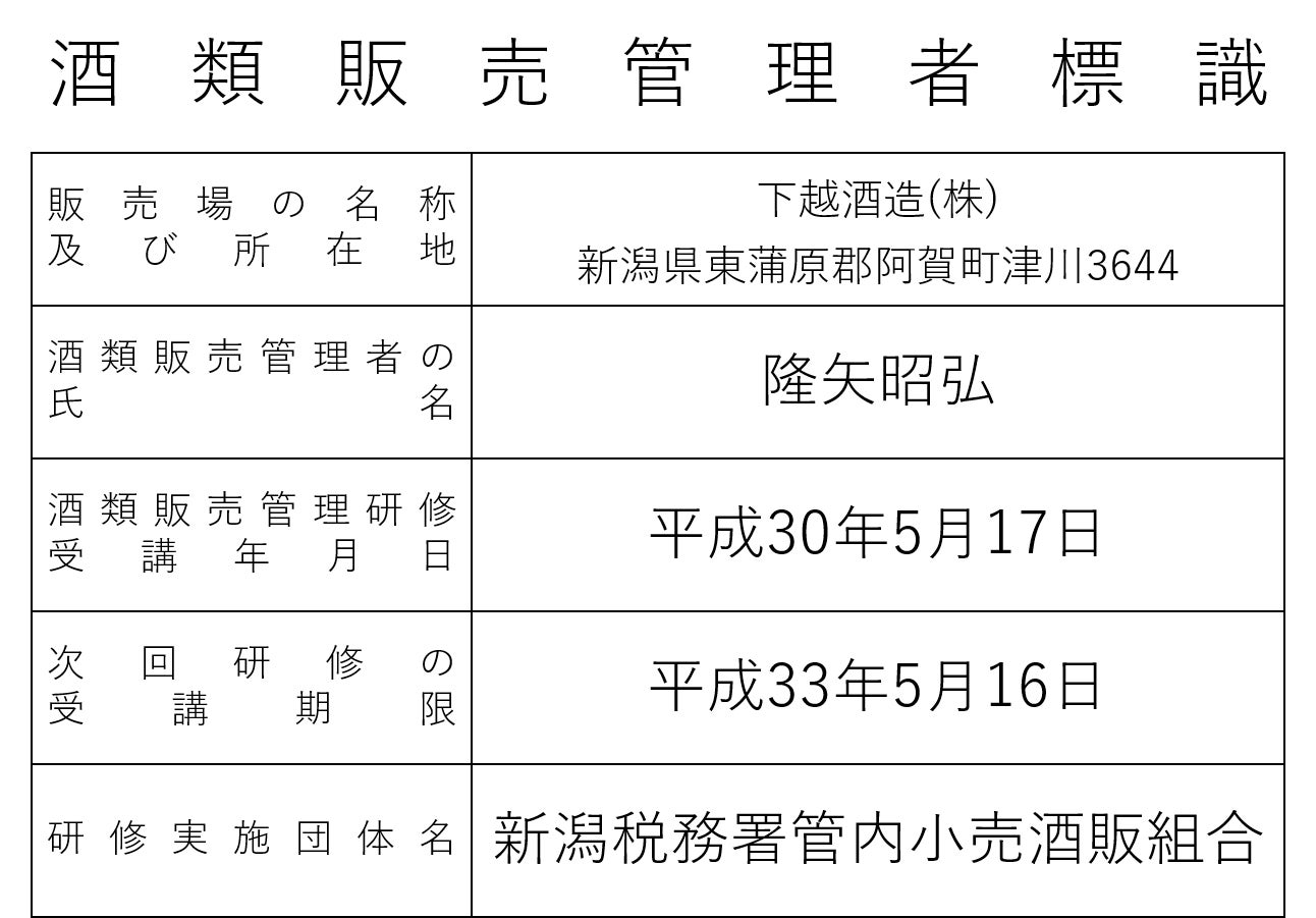また、上記の酒類を含むリターン清酒「蒲原」については、本プロジェクトの共同起案者である下越酒造株式会社様の協力で実施させていただきます。酒類販売免許番号・管理者標識は以下の通りです。