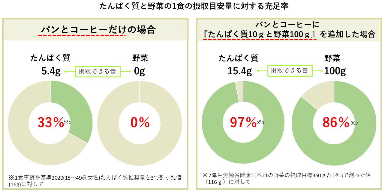 こちらのグラフは、たんぱく質と野菜の1食に必要な量が各食事でどのくらい足りているのかを比較したものです。