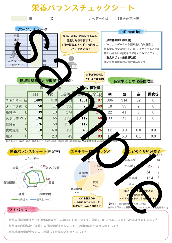 1日分の食事写真を送って頂き、管理栄養士が内容を解析し食事のバランスを判定します。自分自身の食事が適正なのかがグラフ化されててわかりやすいと好評いただいています。ご自身の食事バランスチェックなどにご活用ください!