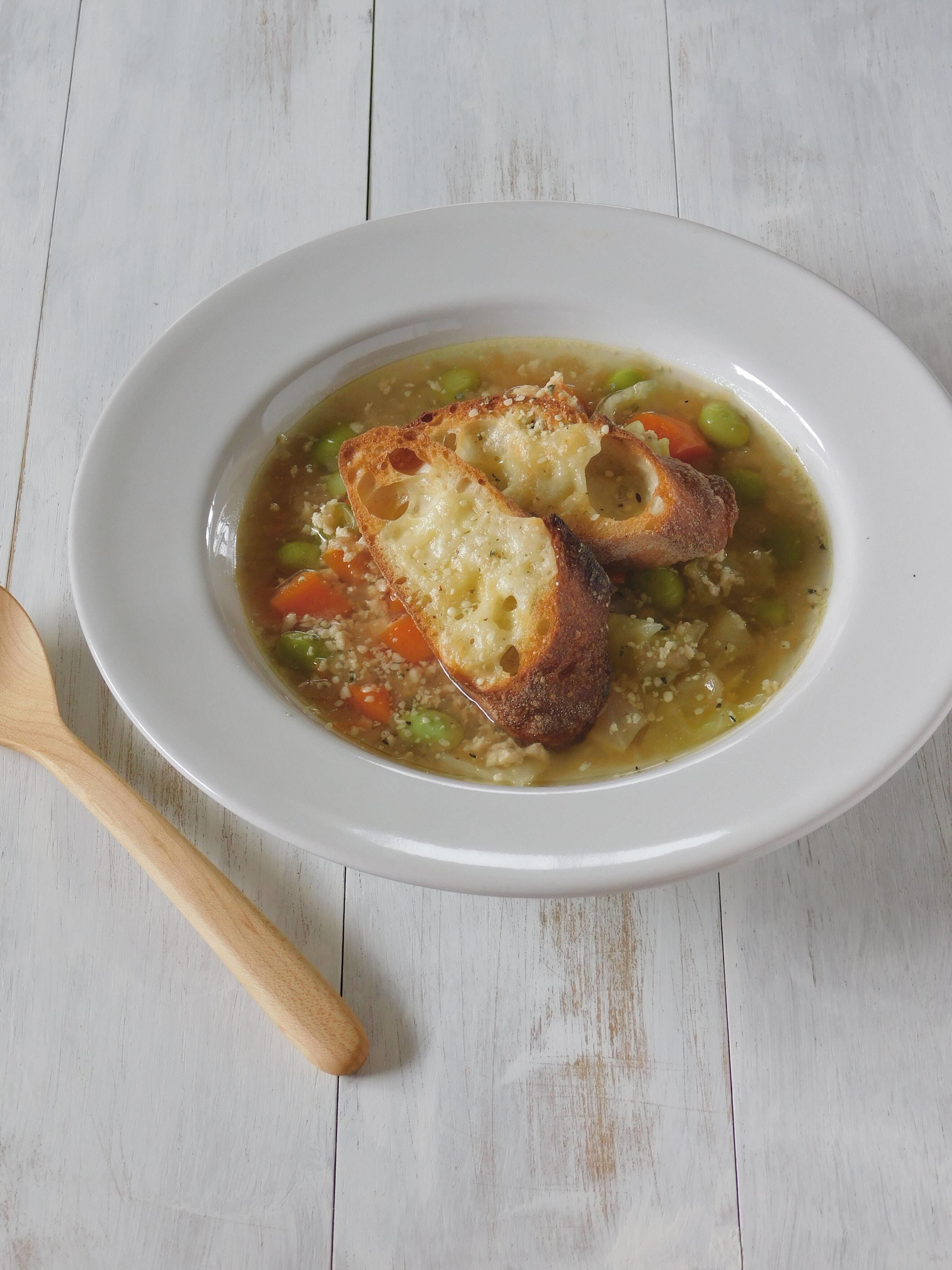 キャベツをはじめとする野菜がザクザク入ったオニオンスープ。