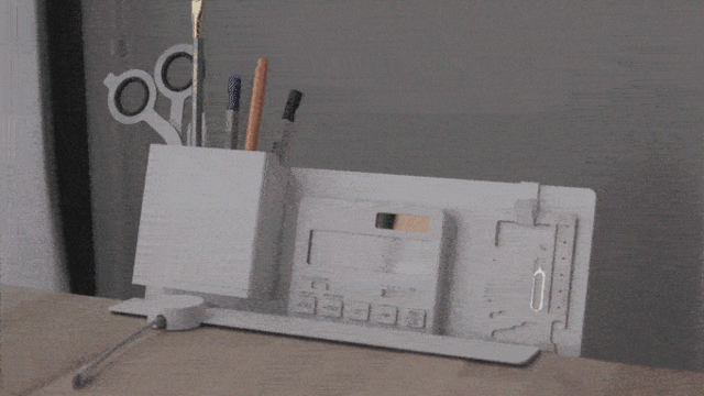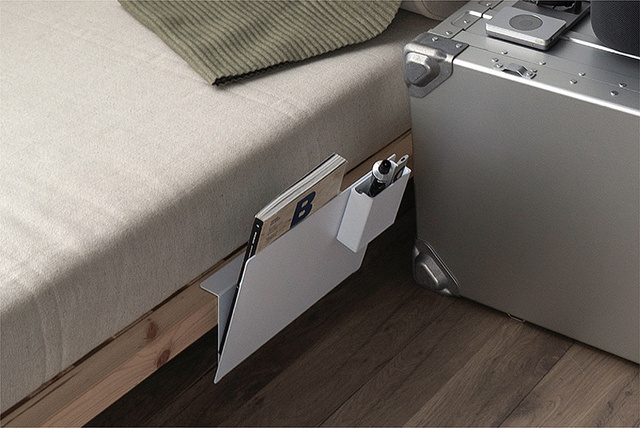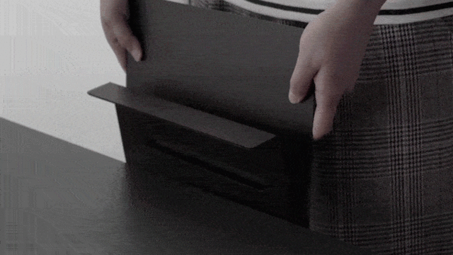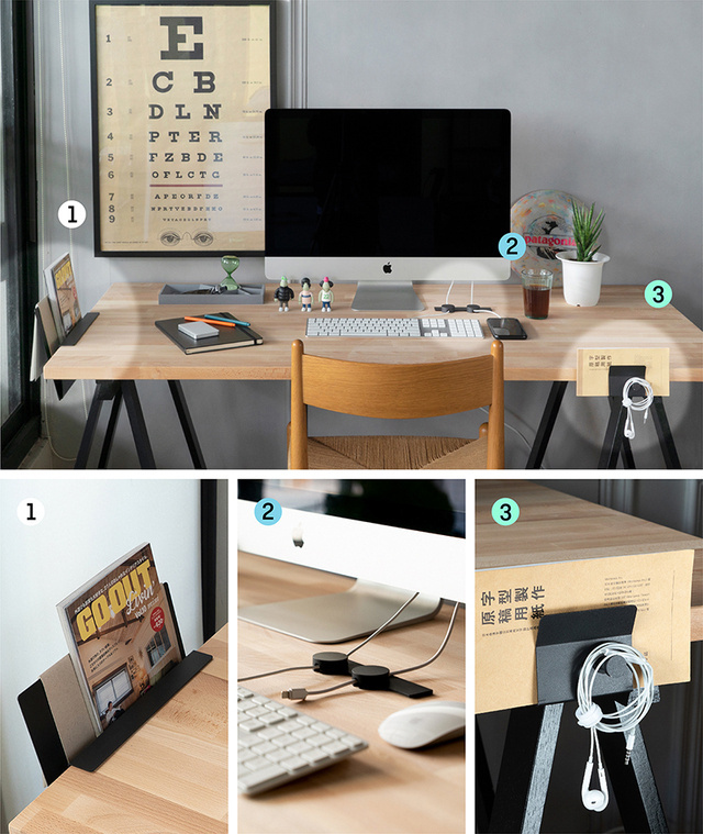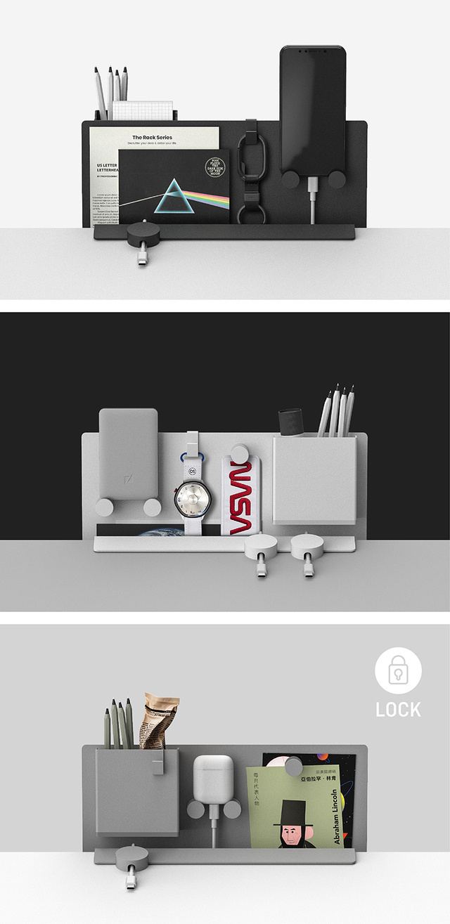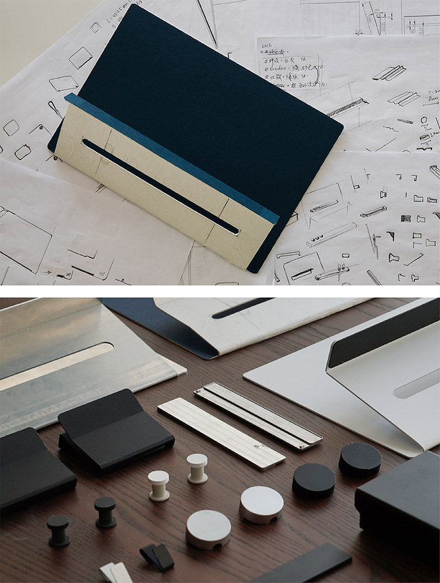 コンセプト考案の初期段階で、現在一般的なデスク収納の概念を改め直そうと、場所をデスク上からデスク横に、形をケース型からラック型に変更する提案をしました。中期段階では、収納本体ではなく、収納する「モノ」に注目がいくよう、外観を極限までシンプルにしました。屏風状のデザインで、お気に入りのモノを目立たせる事ができます。他にも、読みかけの雑誌を開いたままかけて置くなど、しおり代わりとして活用する事ができ、またかける雑誌によってデスク全体の雰囲気をガラリと変える事ができます。後期段階では、プロトタイプ制作やサンプルテストの段階に入り、台湾の優れた加工技術のおかげで、短い期間ながらに、チームメンバー全員の満足のいく製品に仕上がりました。皆様に直接手にとって頂けるのをとても楽しみにしています!