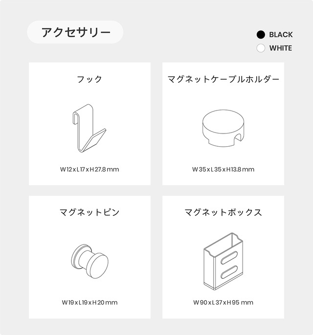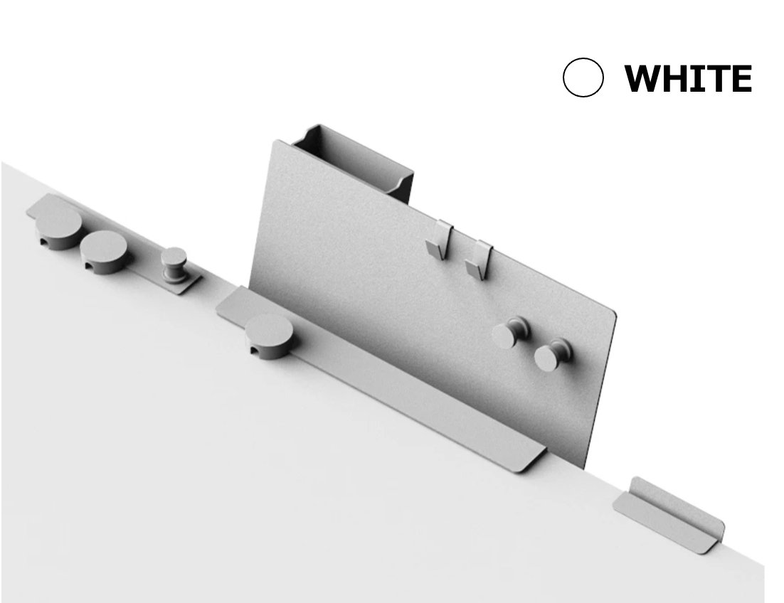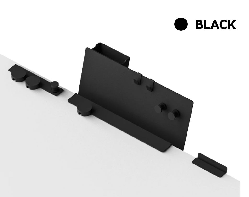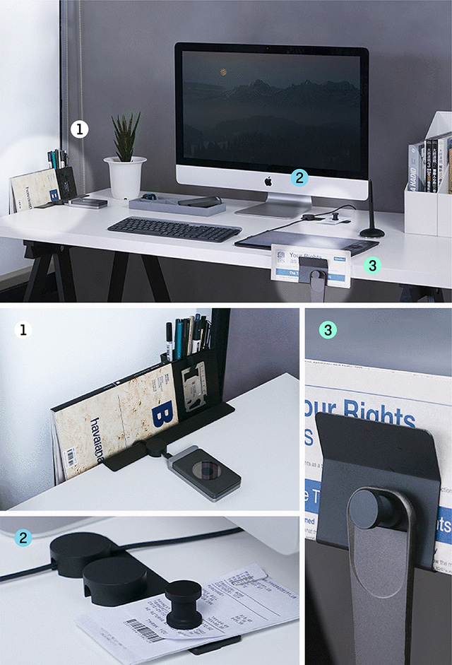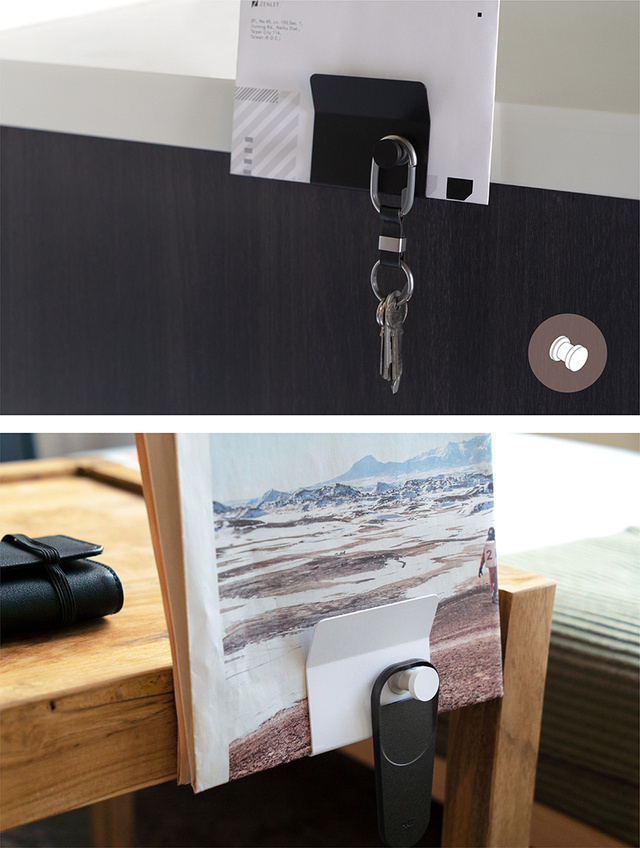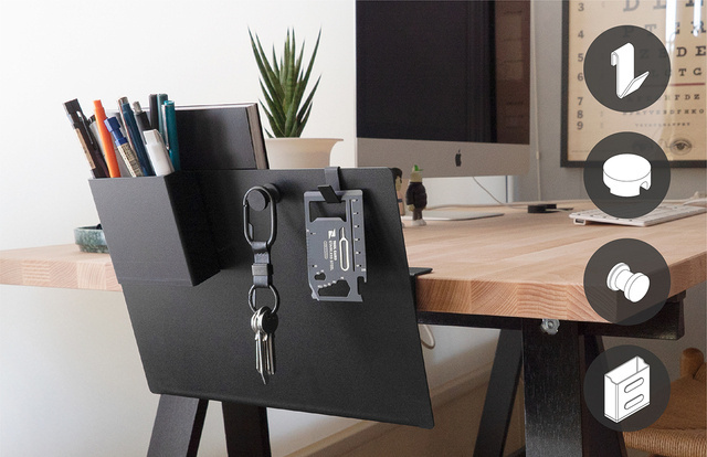 ねじいらずで取り付けが簡単;書類や書籍、文房具を直感的に収納;しおりとしても活用可能;フックやプレート、ケーブルホルダーの併用で、更に便利に。