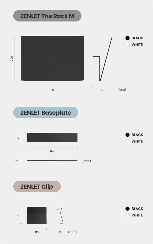 ZENLET The Rack│Mシリーズ は、「ZENLET Clip」「ZENLET Baseplate」「ZENLET The Rack M」の3つの主製品と4つの専用アクセサリーを組み合わせて使用します。