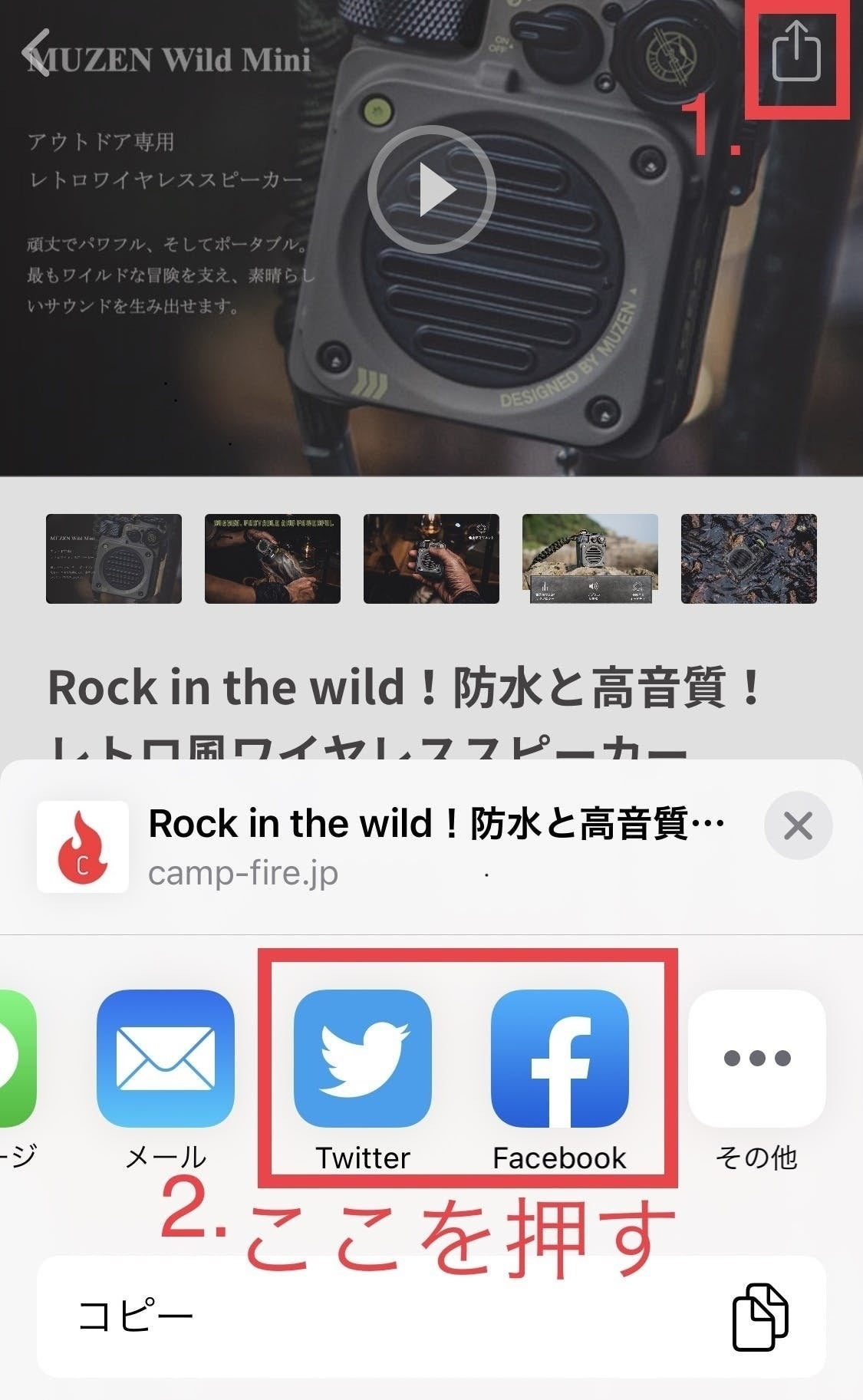 2.プロジェクトページでの「Facebookでシェア」、または「Twitterでツイート」を押して、muzenへの一言こもにシェアします。