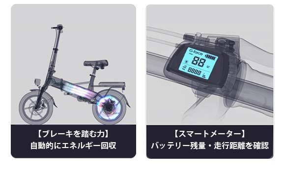 通常は自動車に採用されているこのシステムを電動アシスト自転車「G-force G14」に搭載することで、省エネルギーかつ効率よく長距離の走行を可能にしました。
