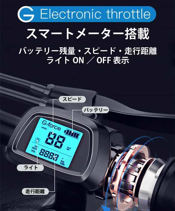 ハンドルバーに設置された「スマートメーター」で、バッテリー残量・スピード・走行距離・ライトON/OFFを一目で確認できるため、安心して走行できます。