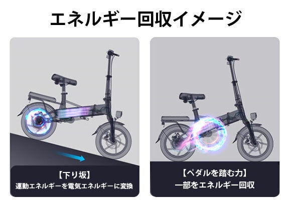 下り坂を走る際の運動エネルギーを走行のためのエネルギーとして変換し、自動回収します。また、走行時のペダルを踏む力の一部や、ブレーキをかける際にもエネルギーの自動回収を行います。