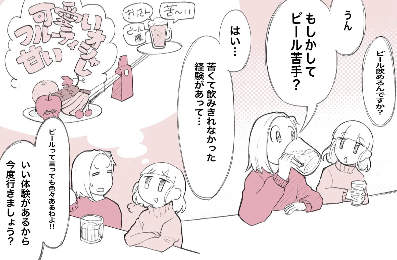 ・ビールが苦手な女子大生4人が、市販のビールをジュースで割って飲む、色の変化を楽しむことで、飲みやすさと苦さを両立させるアイデアから生まれました。