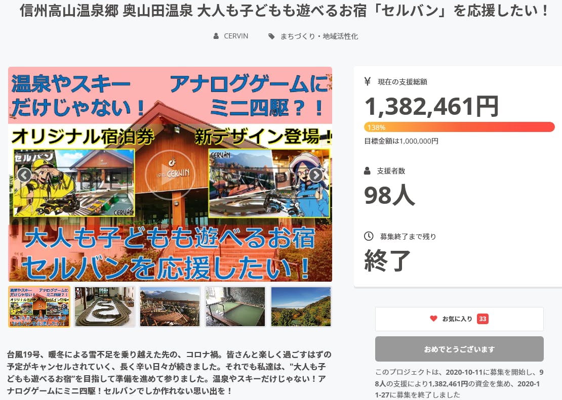 2019年10月の台風19号被害に始まり、暖冬による雪不足、そして新型コロナウイルスによるお客様の激減。セルバン始まって以来の困難に直面し、何度も心が挫けそうになりました。それでも、2020年10月に初めて挑戦させて頂いたクラウドファンディング「信州高山温泉郷 奥山田温泉 大人も子どもも遊べるお宿 セルバンを応援したい!」で、本当に沢山のの方々からの温かい心のこもった御支援を賜り、この先も頑張っていく為の勇気を貰いました。