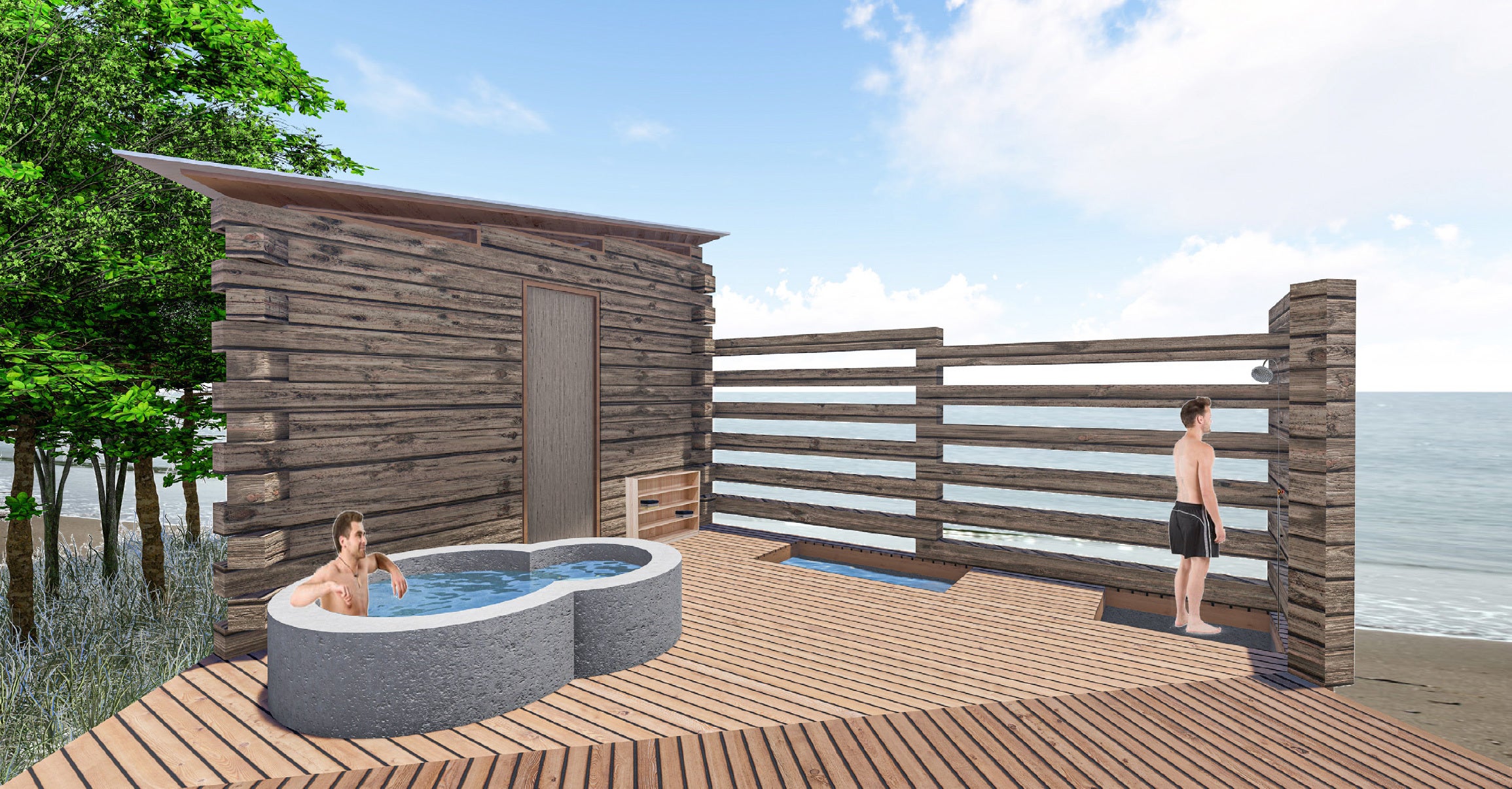 当宿には天然の井戸水が自噴しており、目の前は海水浴場ですので「水風呂は東京湾」というなんとも贅沢なコンセプトが浮かび上がり、なんとか実現したいと進めて参りました。