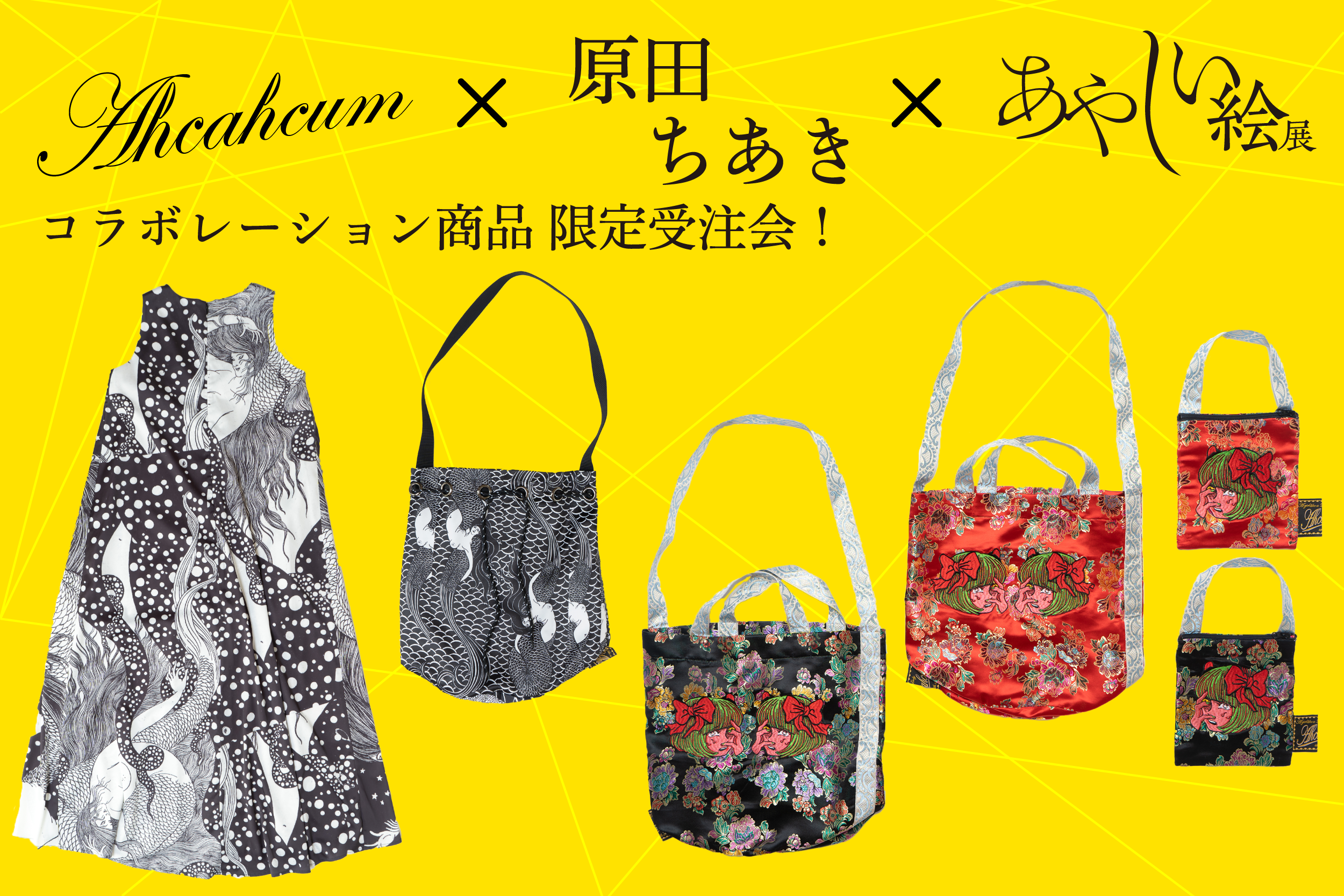 話題の「あやしい絵展」開催を記念して、カリスマ的な人気ブランド【ahcahcum(あちゃちゅむ)】×イラストレーター【原田ちあき】×あやしい絵展の限定コラボレーションアイテムの受注受付が明日(5月16日)に受付終了となります。ワンピース・トートバッグ・ミニバッグなど全6種の特別受注を期間限定で行います。実用的かつ普段使いできる商品が勢揃いしていますので、お申込みお待ちしております。詳細はこちらhttps://camp-fire.jp/projects/view/401591?list=booster_recomended