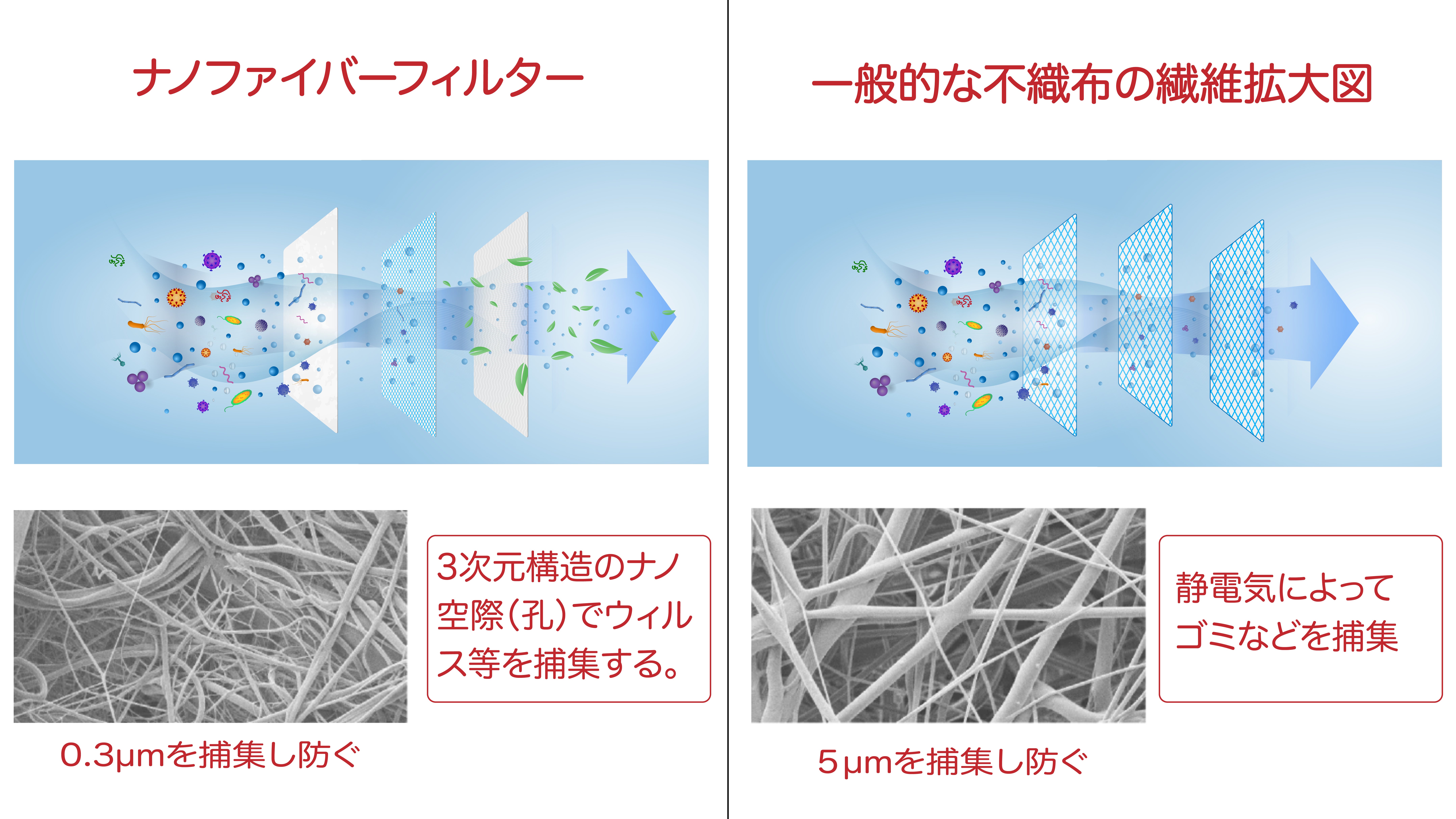 静電吸着の原理で繊維よりも細かいウイルスを集め、ブロックするという構造です。