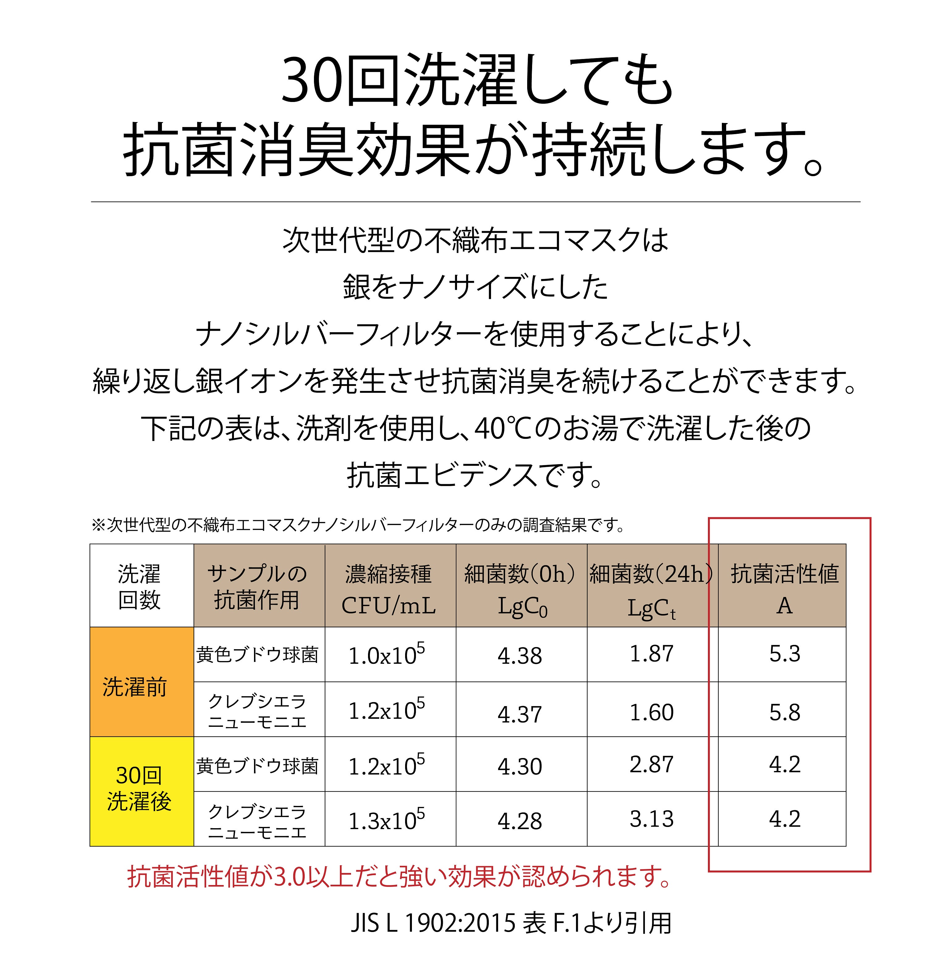 しかし、次世代マスクのフィルター効果は、洗濯しても飛沫の捕捉効果は落ちず、消臭抗菌機能も継続します。